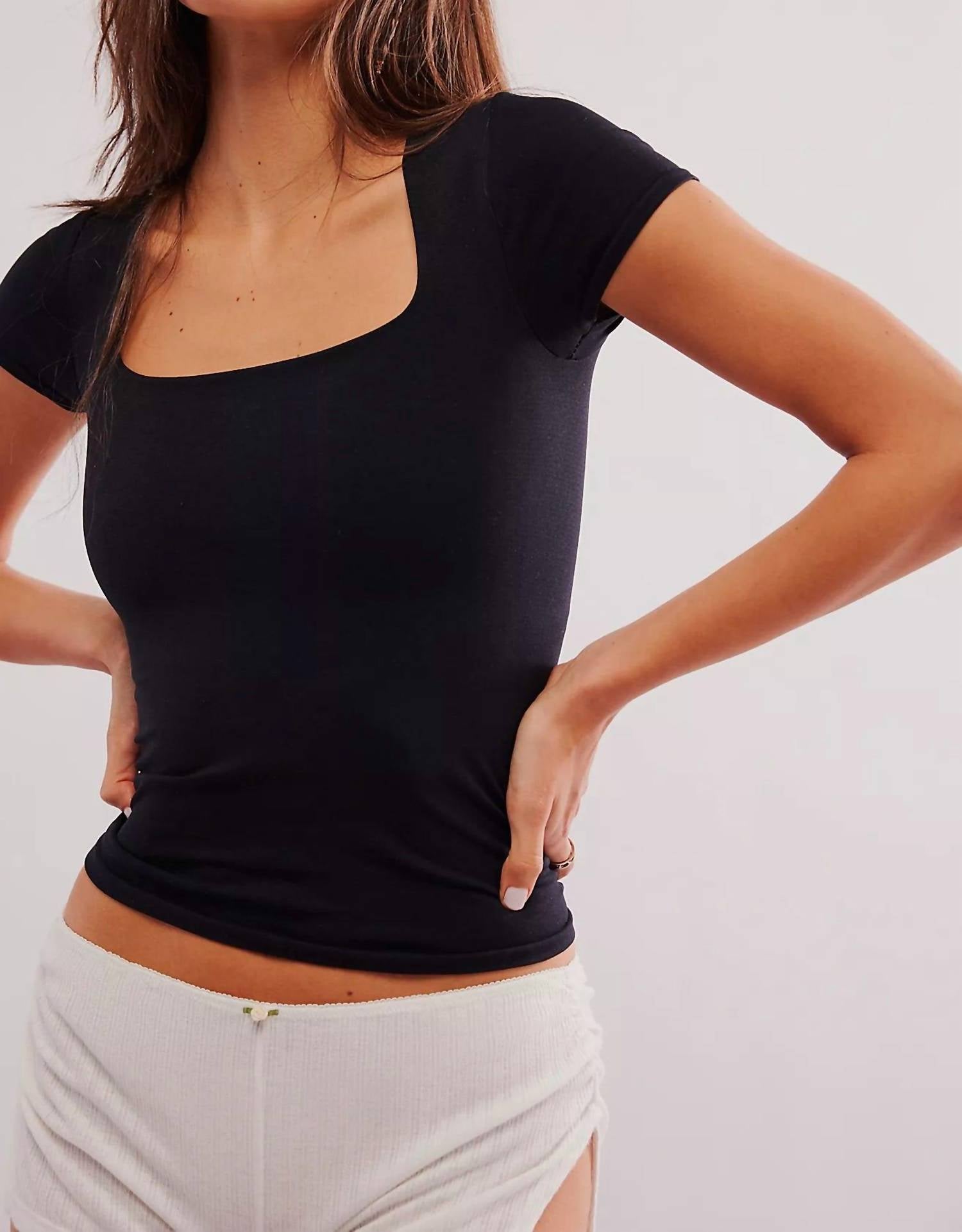 This classic, short sleeve tee will be your go-to staple this season and beyond. Introducing the Clean Lines Baby Tee by Free People, a seamless staple for your wardrobe. This black tee features short sleeves and a square neckline, crafted from a buttery soft nylon blend in a hip-length design. Closure: Pull-on. Care: Machine washable, making it an effortlessly chic choice for everyday wear.
