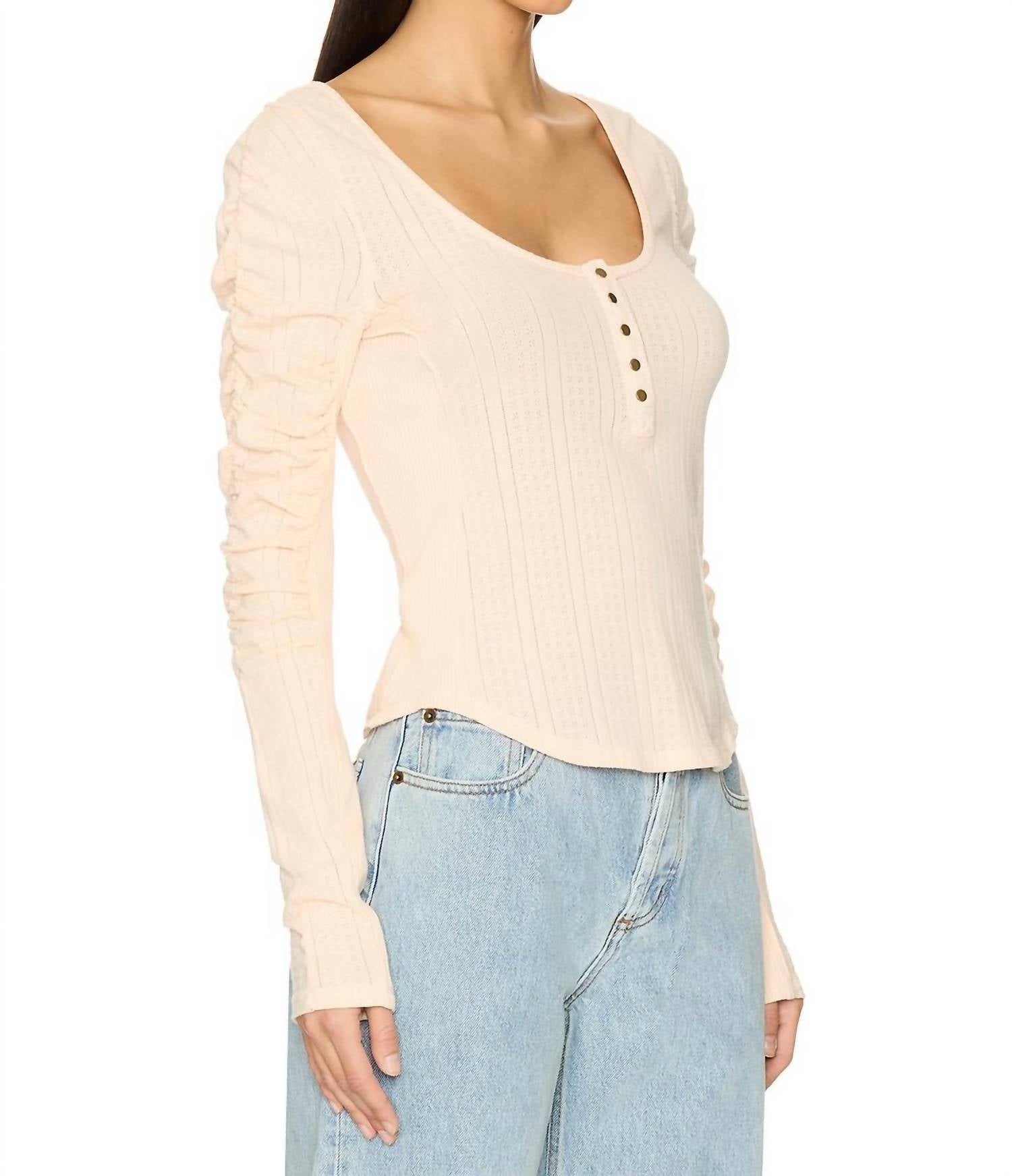 The perfect long sleeve tee that goes with just about anything. Elevate your wardrobe with the Free People Hope Henley Top in the delightful Strawberry Float shade. This stylish piece features long rouched sleeves and a scoop neck, crafted from 100% cotton for ultimate comfort. Its closure type is snap, and it's designed with practicality in mind, being machine washable and suitable for tumble drying on low heat. Model Madi is 5'6" and dressed in a size medium, capturing the minimalist trend perfectly.