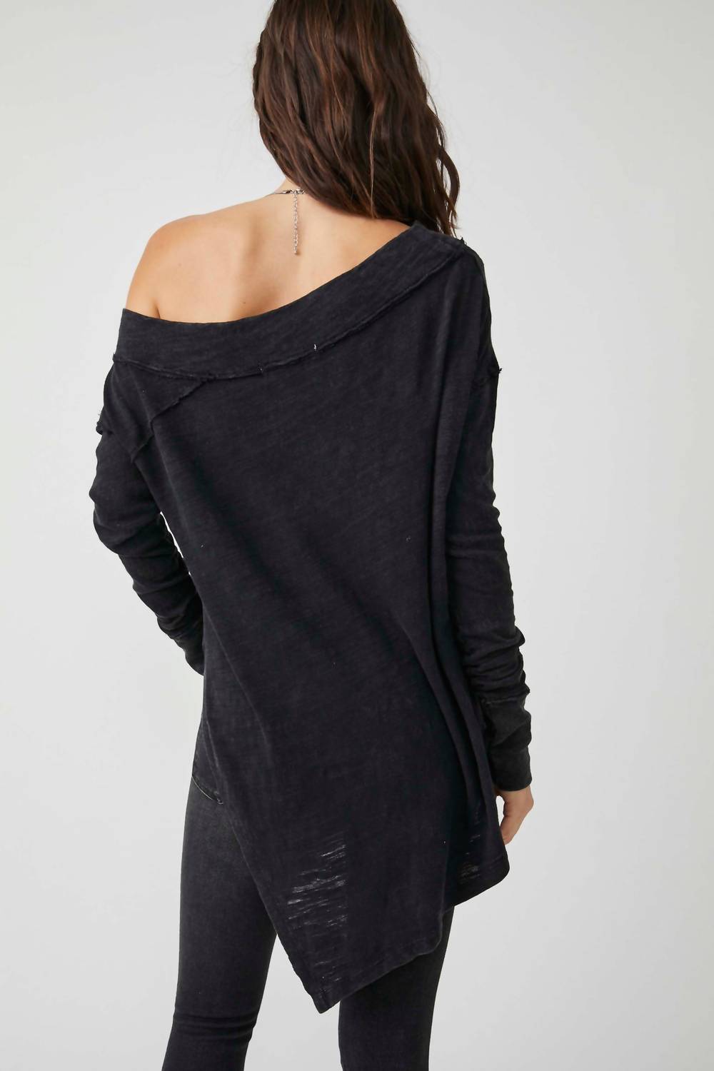 The perfect long sleeve tee that goes with just about anything. Elevate your wardrobe with the "To The Right" Long Sleeve Tee by Free People, offering a perfect blend of style and comfort. Crafted from 100% Cotton, this black top features long sleeves and an off-the-shoulder drapey design with exposed seaming and exaggerated side slits for added flair. It's made to be a versatile essential with a slouchy, relaxed fit, featuring a boatneck and pull-on closure. Measuring 46 inches at the bust, 32.5 inches in length, with 23-inch sleeves, it is machine washable and should be line dried.