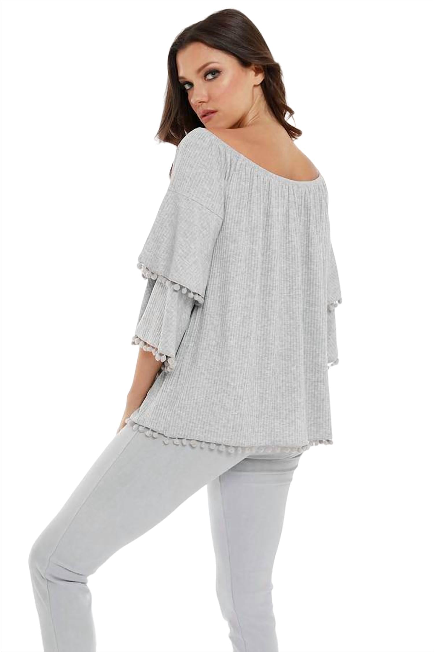 Embrace the versatility of this tunic-style blouse, expertly crafted for seamless layering or perfect to wear on its own. Its detailed design and comfortable fit make it a perfect addition to any closet.65% Polyester 35% ViscoseDelicate hand wash or dry cleanoverviewImportedfrench kyss topOff the shoulderPom pom detail3/4 sleevesHits at hip