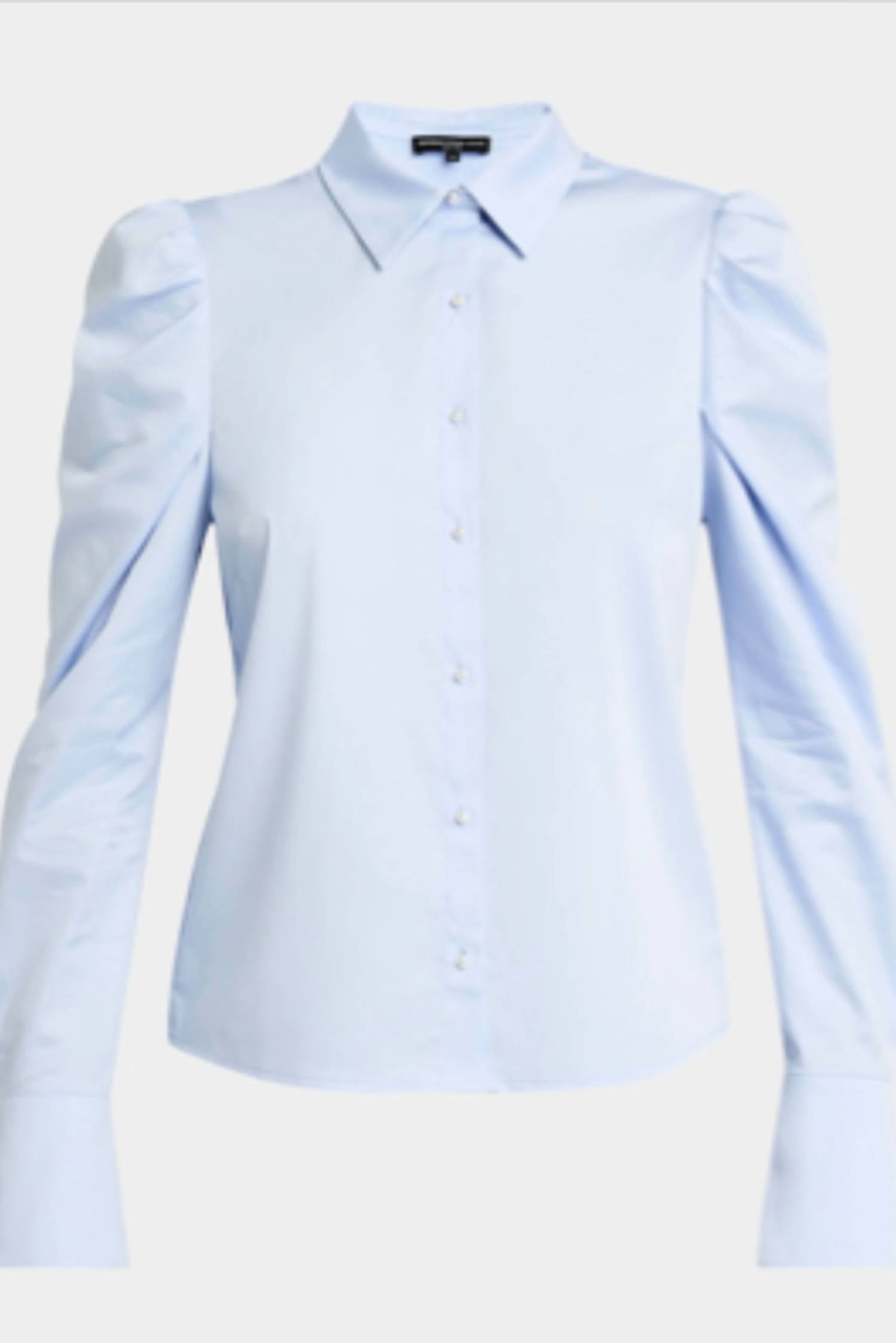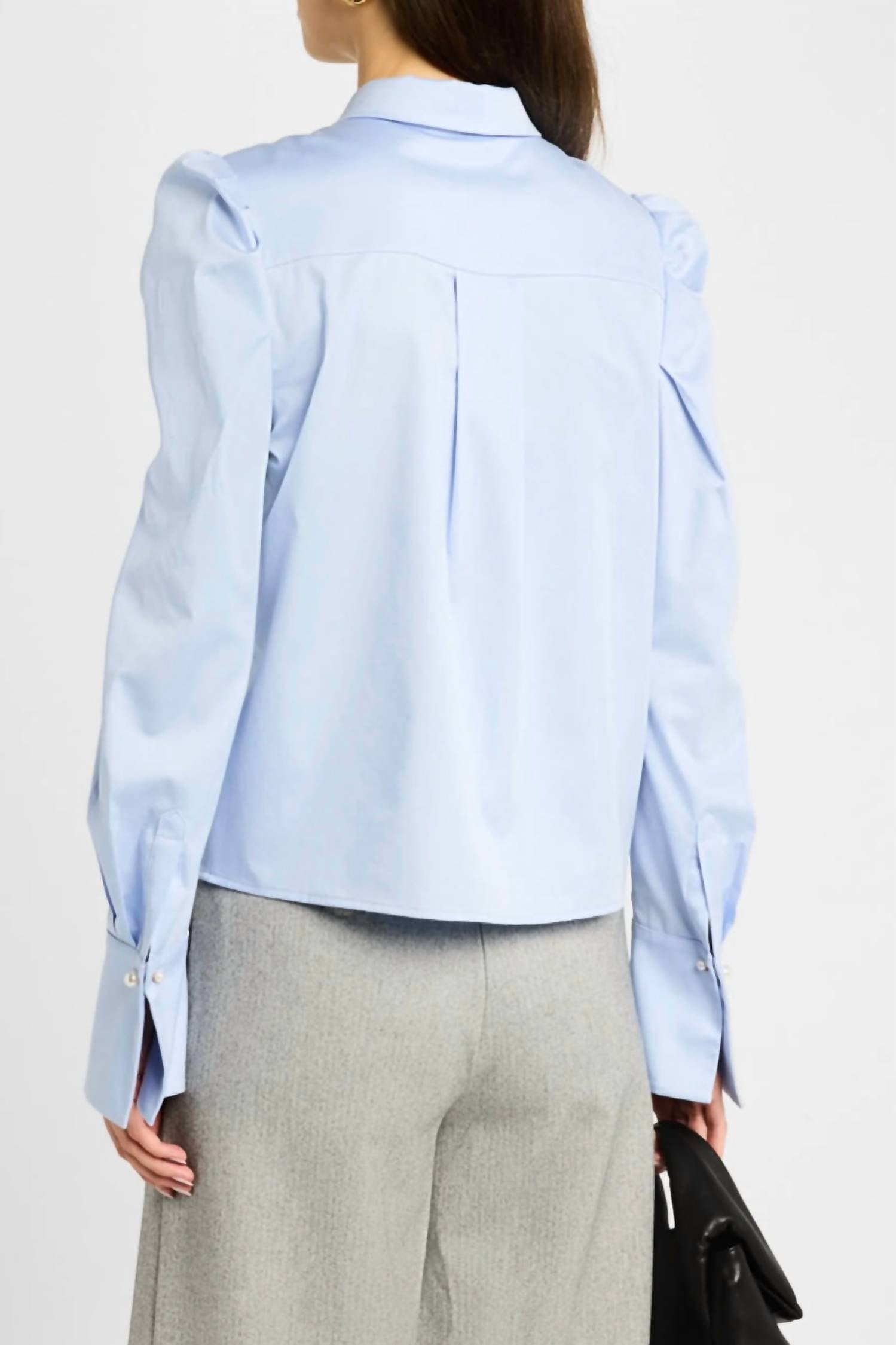 This button down shirt is comfortable yet polished. Introducing the Lyra Shirt by Generation Love in a delicate powder blue, perfect for making a statement this spring. This long sleeve button-down blouse features subtly puffy sleeves with exaggerated cuffs and petite pearl shank buttons, encapsulating timeless elegance and modern flair. Composition: 94% Cotton, 6% Elastane; Length: 22.5 inches. Closure: Button closure. Care: Hand wash, lay flat to dry or opt for professional dry cleaning. Model wears size XS (5'10" height).