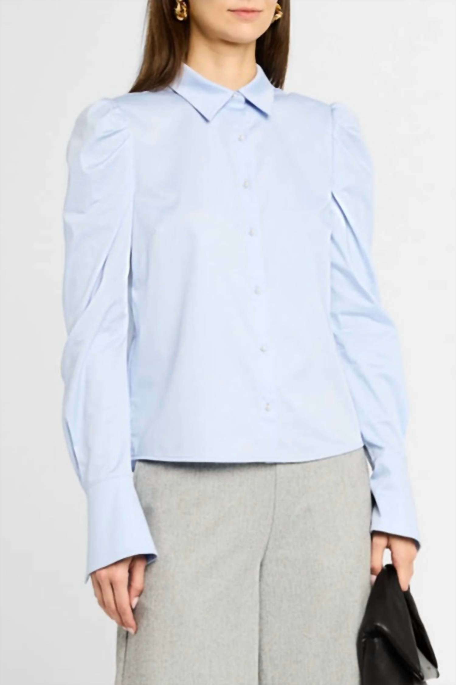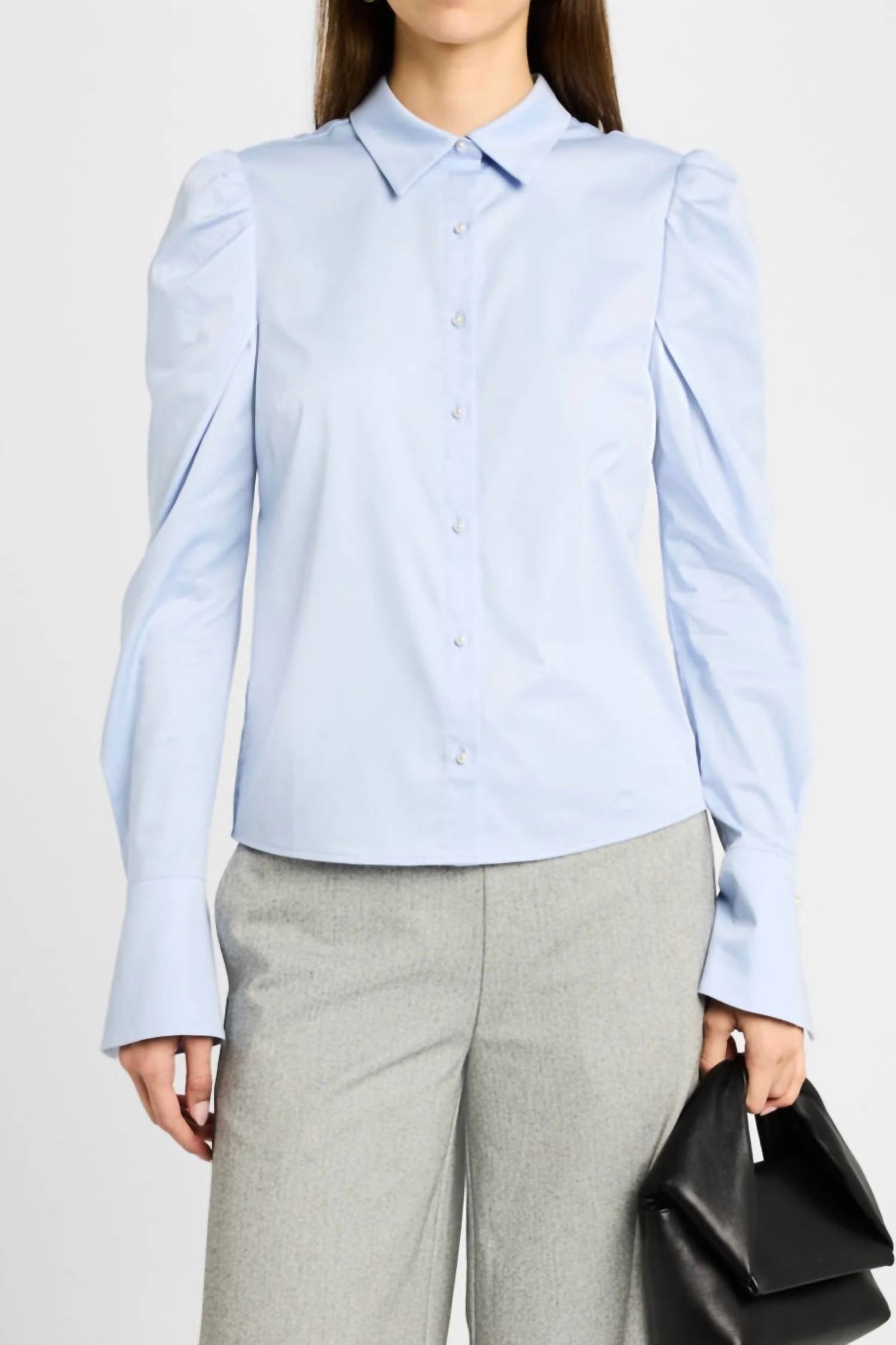 Introducing the Lyra Shirt by Generation Love in a delicate powder blue, perfect for making a statement this spring. This long sleeve button-down blouse features subtly puffy sleeves with exaggerated cuffs and petite pearl shank buttons, encapsulating timeless elegance and modern flair. Composition: 94% Cotton, 6% Elastane; Length: 22.5 inches. Closure: Button closure. Care: Hand wash, lay flat to dry or opt for professional dry cleaning. Model wears size XS (5'10" height).