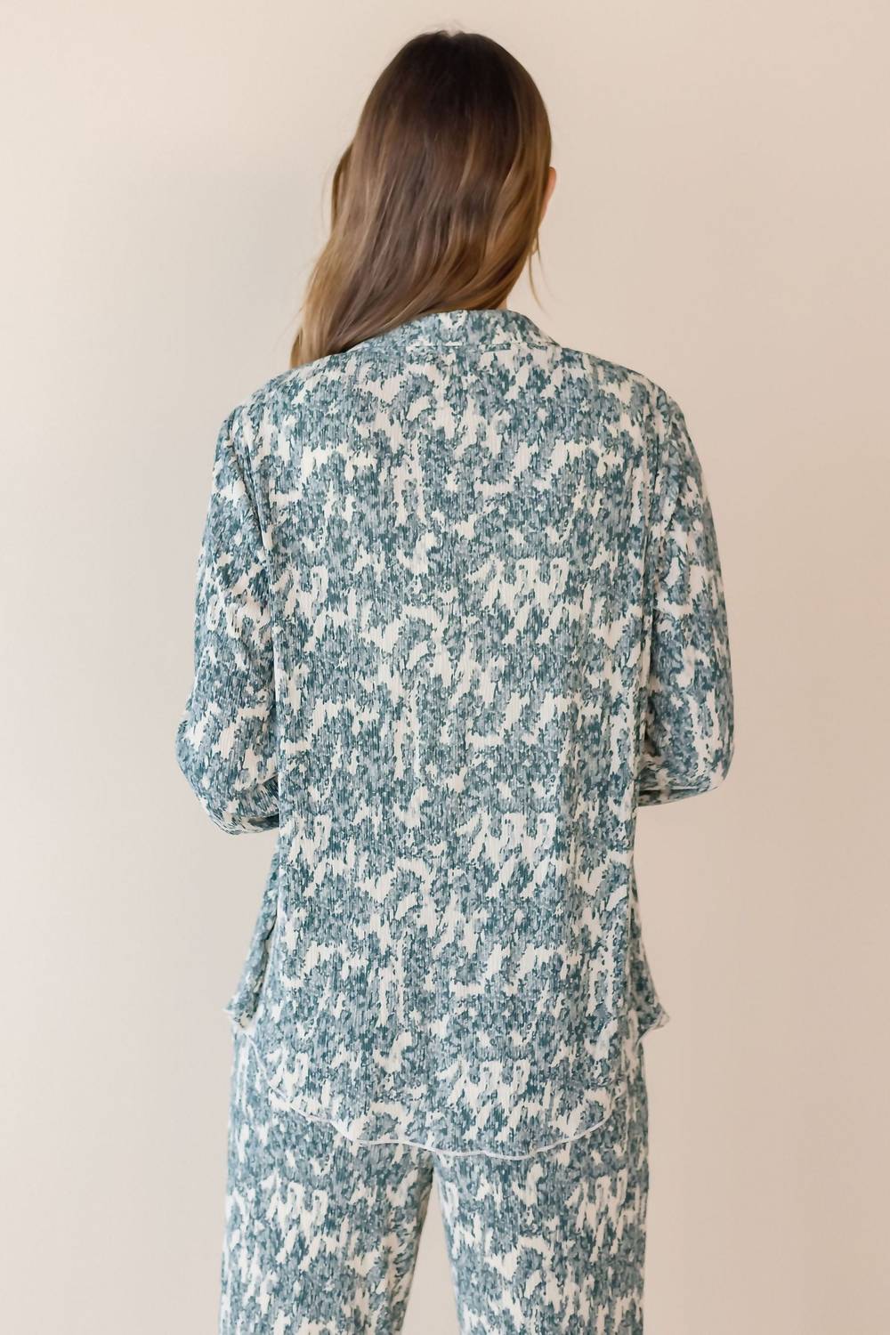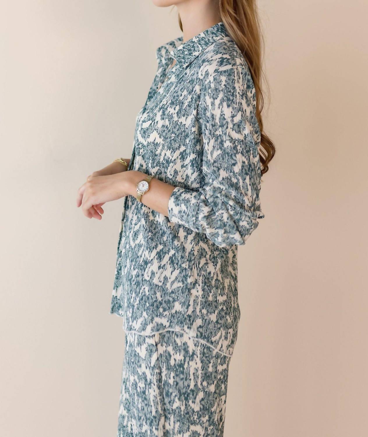 A classic button down shirt that will never go out of style. Meet the Sheila Button Down by Gentle Fawn, a chic addition to any wardrobe with its distinctive cream and heather pine pattern. Crafted from 100% polyester, this long sleeve shirt offers a soft crepe fabric with a crinkled effect, perfect for both everyday wear and special occasions. Featuring a button closure with elegant shell buttons, it delivers both style and convenience. Easy to care for, the shirt is machine washable on a gentle cycle and should be hung to dry. Model is 5'9" and is wearing a size small.