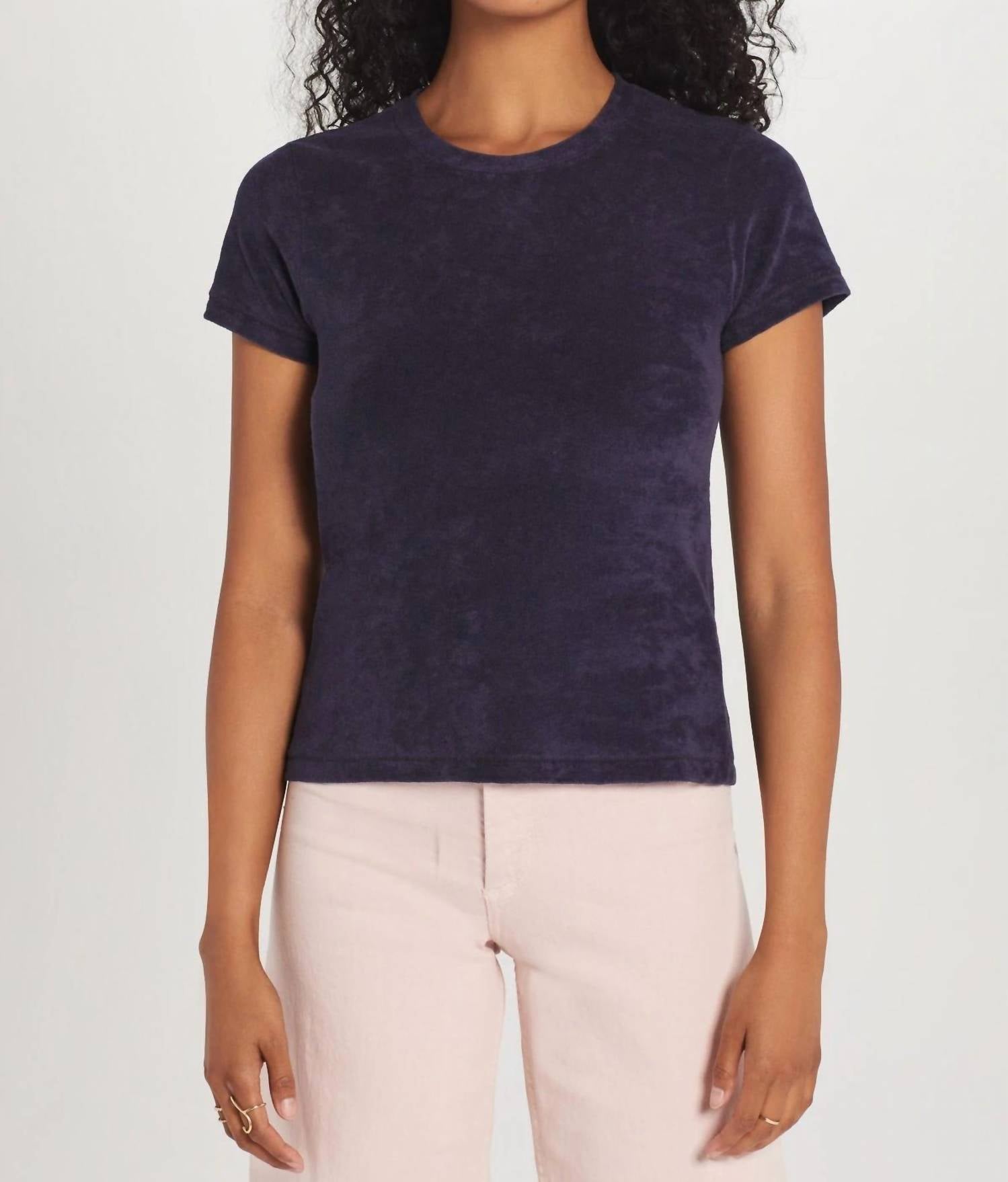 This classic, short sleeve tee will be your go-to staple this season and beyond. Introducing the Micro Terry Tee by GOLDIE, a perfect choice for a luxe and laid-back style. This navy tee features short sleeves and a crewneck design, crafted from a soft cotton blend of 75% Peruvian Pima Cotton and 25% Polyester. Enjoy the simplicity of a solid pattern with a convenient pull-on closure. Care instructions: Machine wash and tumble dry for effortless maintenance.