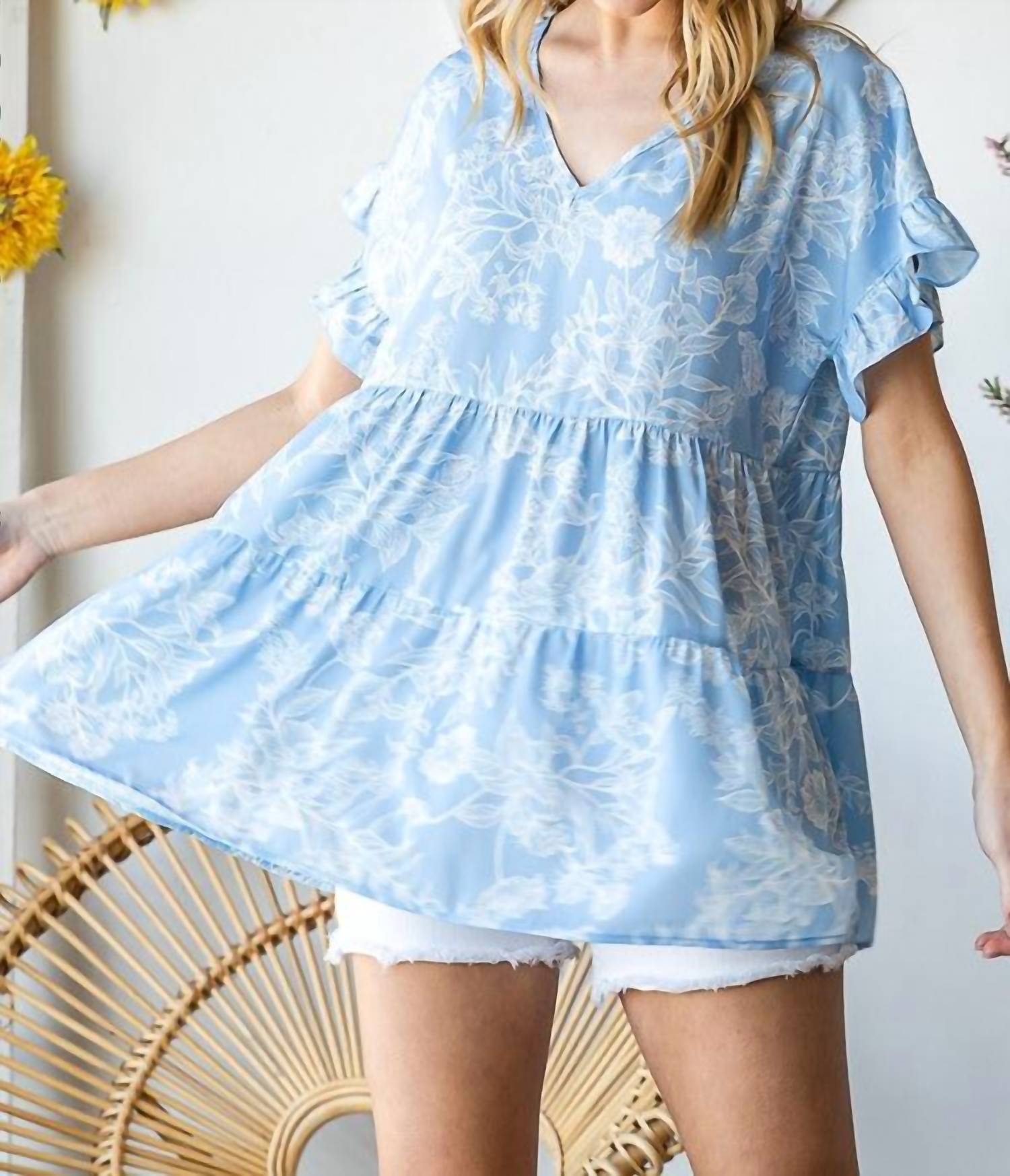 Pair this with your favorite jeans and slides for your next girls night out. Embrace a touch of whimsy with the Floral Babydoll Top by HEIMISH USA, perfect for springtime occasions. This plus-size blouse in light blue features short dolman sleeves and a charming ruffled V-neckline adorned with a floral pattern. Crafted from 100% polyester, it showcases an elegant tiered design with shirring detail for added flair. Easy to wear with a pull-on closure, it is suited for machine wash care.
