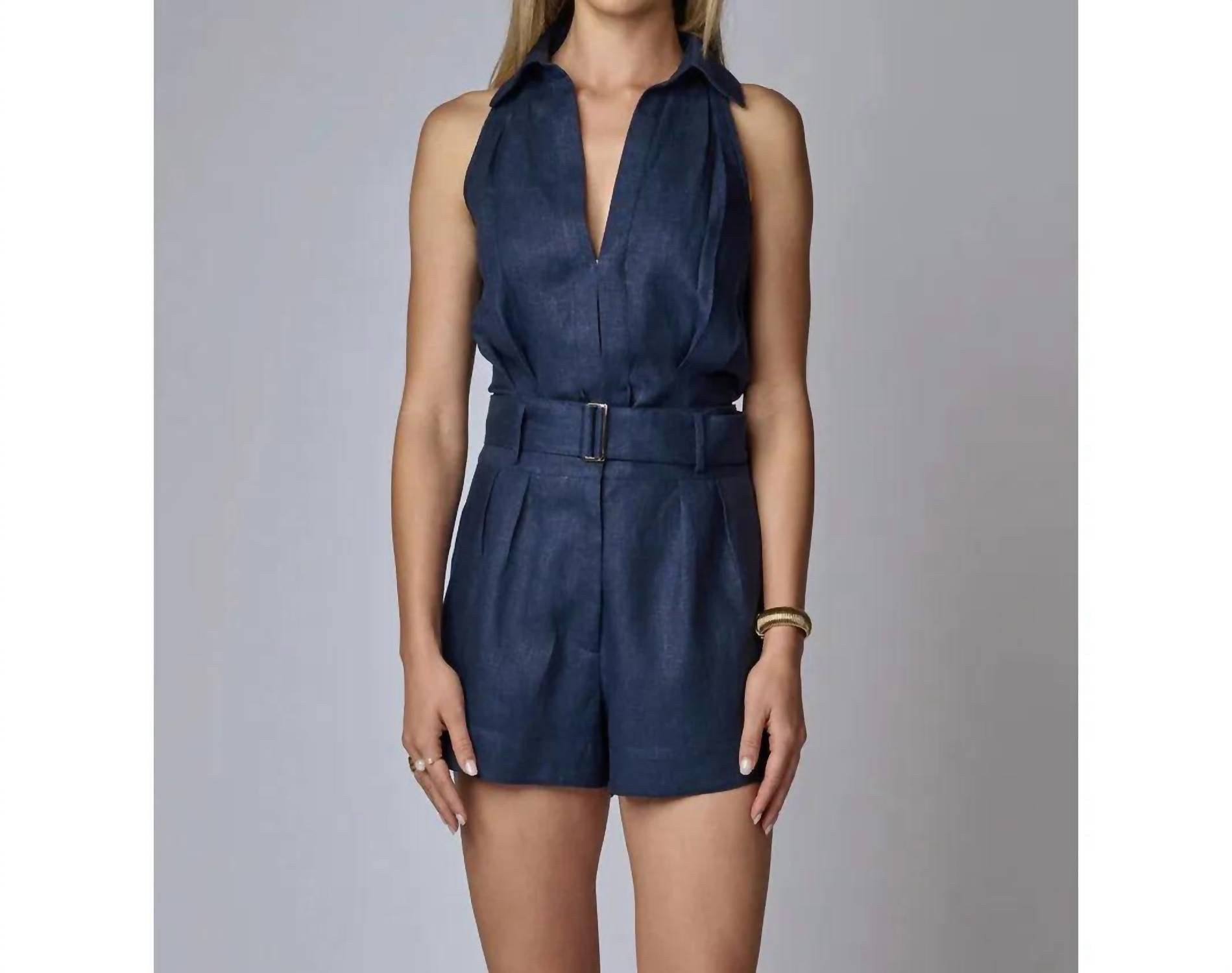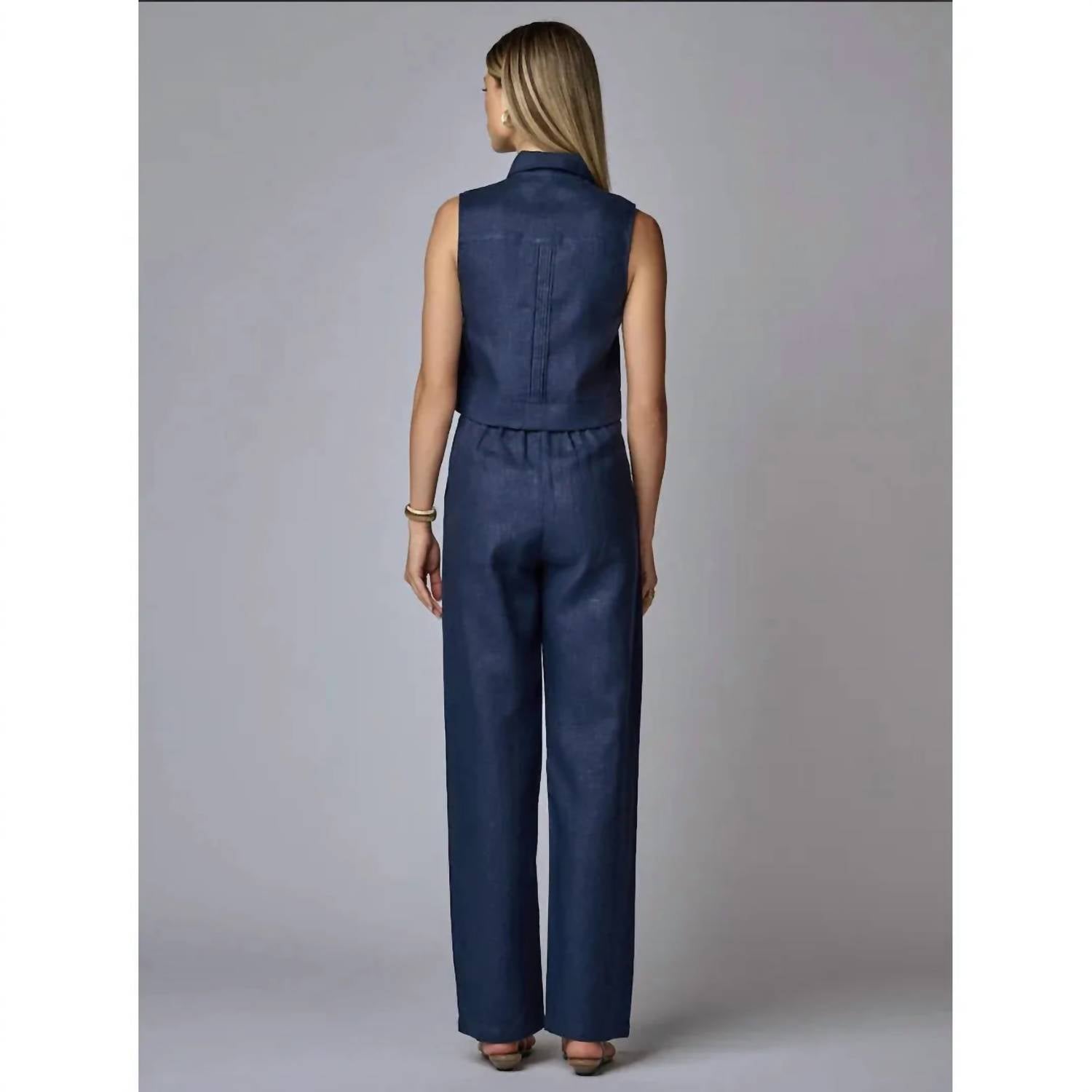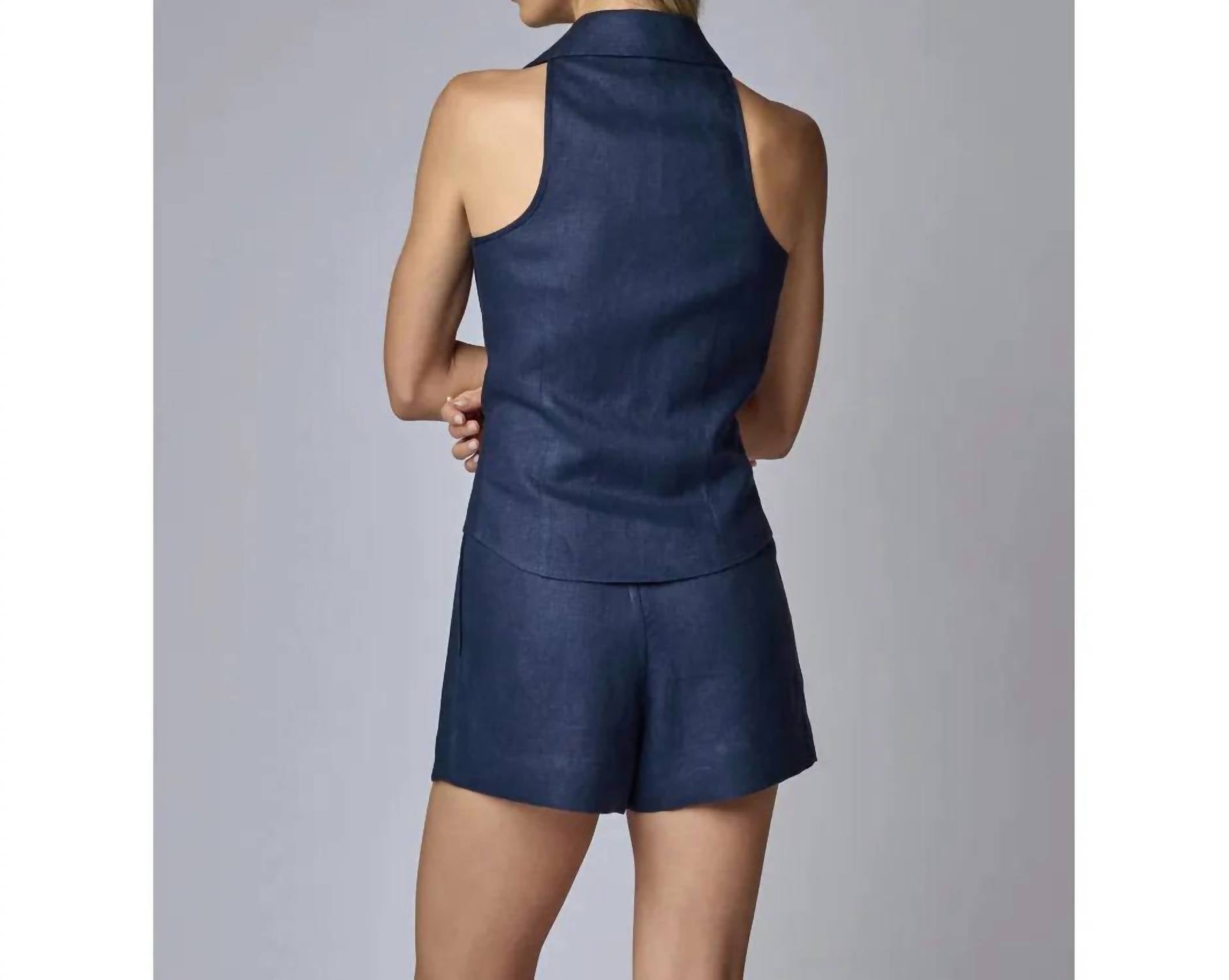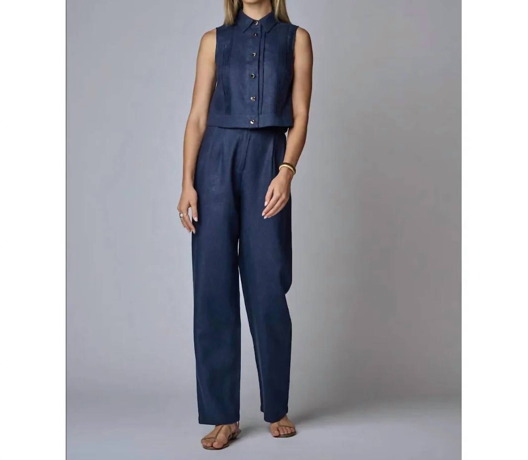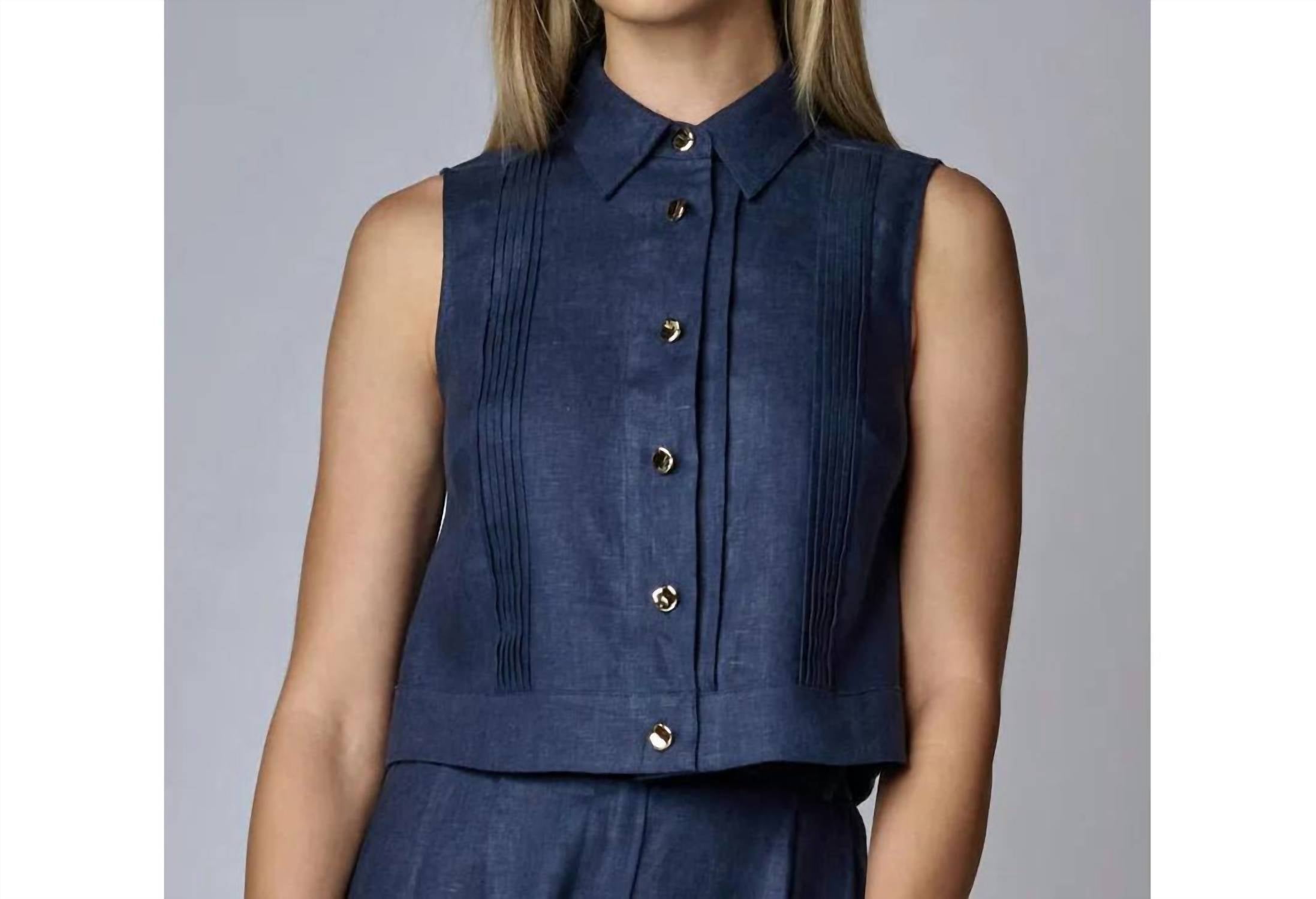 Pair this with your favorite jeans and slides for your next girls night out. Introducing the Vera Top by Hevron, a minimalist piece in elegant Dark Indigo perfect for your summer wardrobe. Featuring a sleeveless design, this top is crafted from 100% linen, ensuring both comfort and style. The Vera Top boasts a 17.25" garment length and a boxy yet tailored fit, enhanced by fine pintuck detailing and gold button closure. Care instructions recommend dry cleaning or machine washing cold on a gentle cycle, with drying flat for best results. Model is wearing a size 2 (Bust: 34 1/2", Length: 17 1/4", 5'9" height).