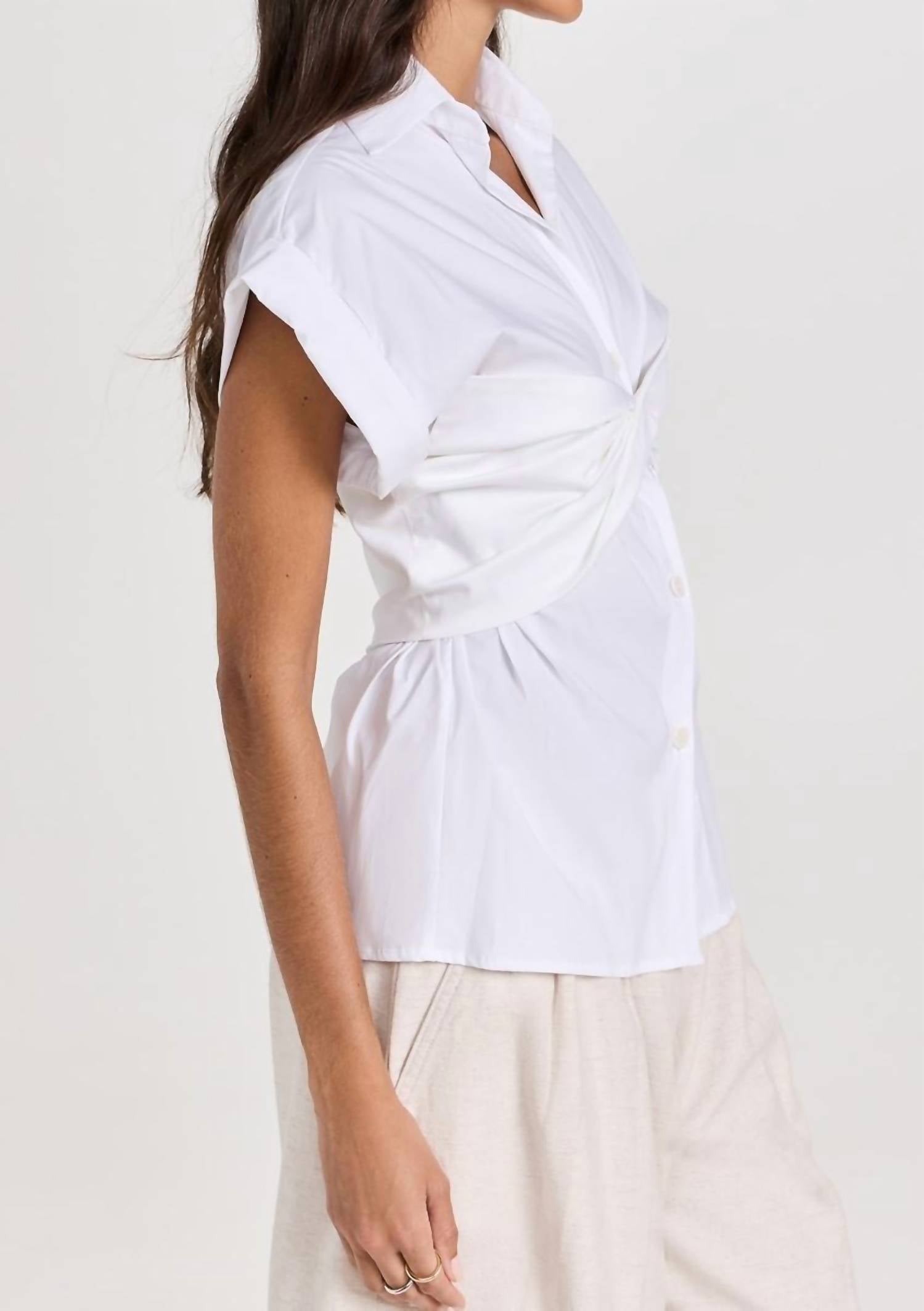 A timeless blouse that will never go out of style. Introducing the Elliot Top Long by JBQ—a stylish blend of contemporary design and classic elegance, perfect for summer vacations. This white blouse features short cuffed sleeves, a collared neckline, and a twist-front bralette silhouette that extends to a full length of 25.25 inches. Crafted in the USA from a mid-weight, stretch poplin fabric that's composed of 97% cotton and 3% spandex, it offers comfort and a flattering fit. The Elliot Top is secured with a back zip and button closure, and it is machine washable for easy care.