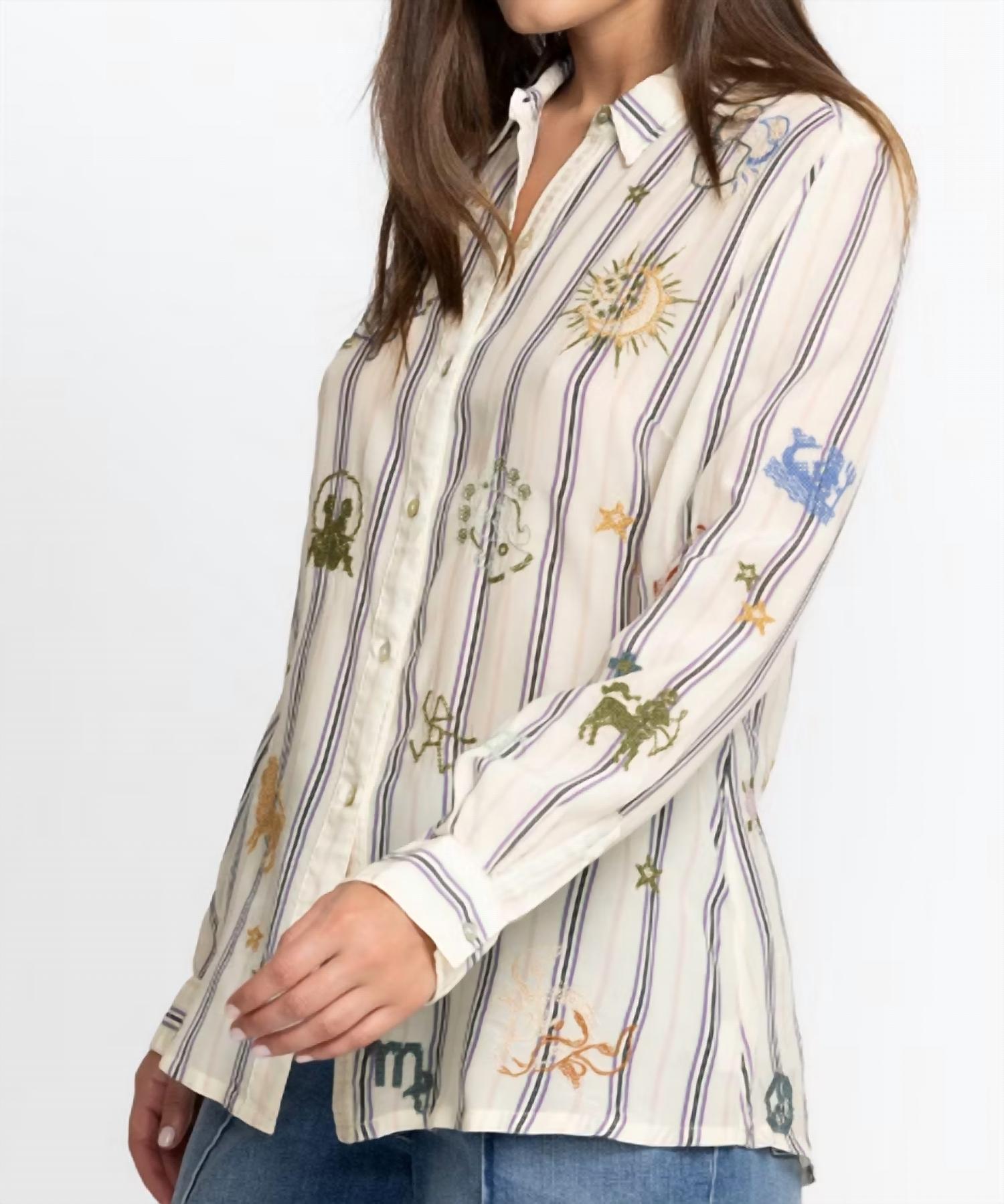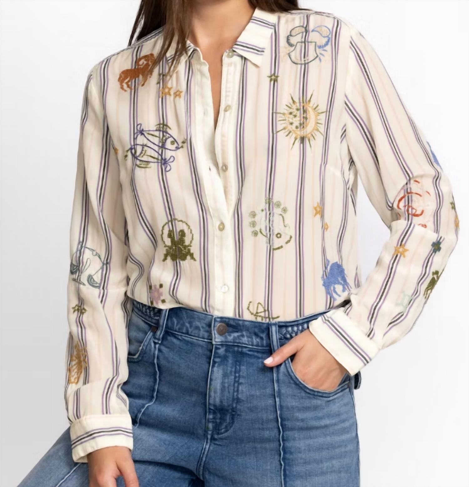 A versatile blouse that works from desk to dinner! Introducing the Ariana Button Back Shirt by Johnny Was, a boho chic blouse perfect for summer occasions like Thanksgiving or church gatherings. This striking piece features a long sleeve design and a collar neckline, crafted from luxurious silk. Patterned with stylish stripes, it offers both elegance and comfort. For optimal care, dry clean only.