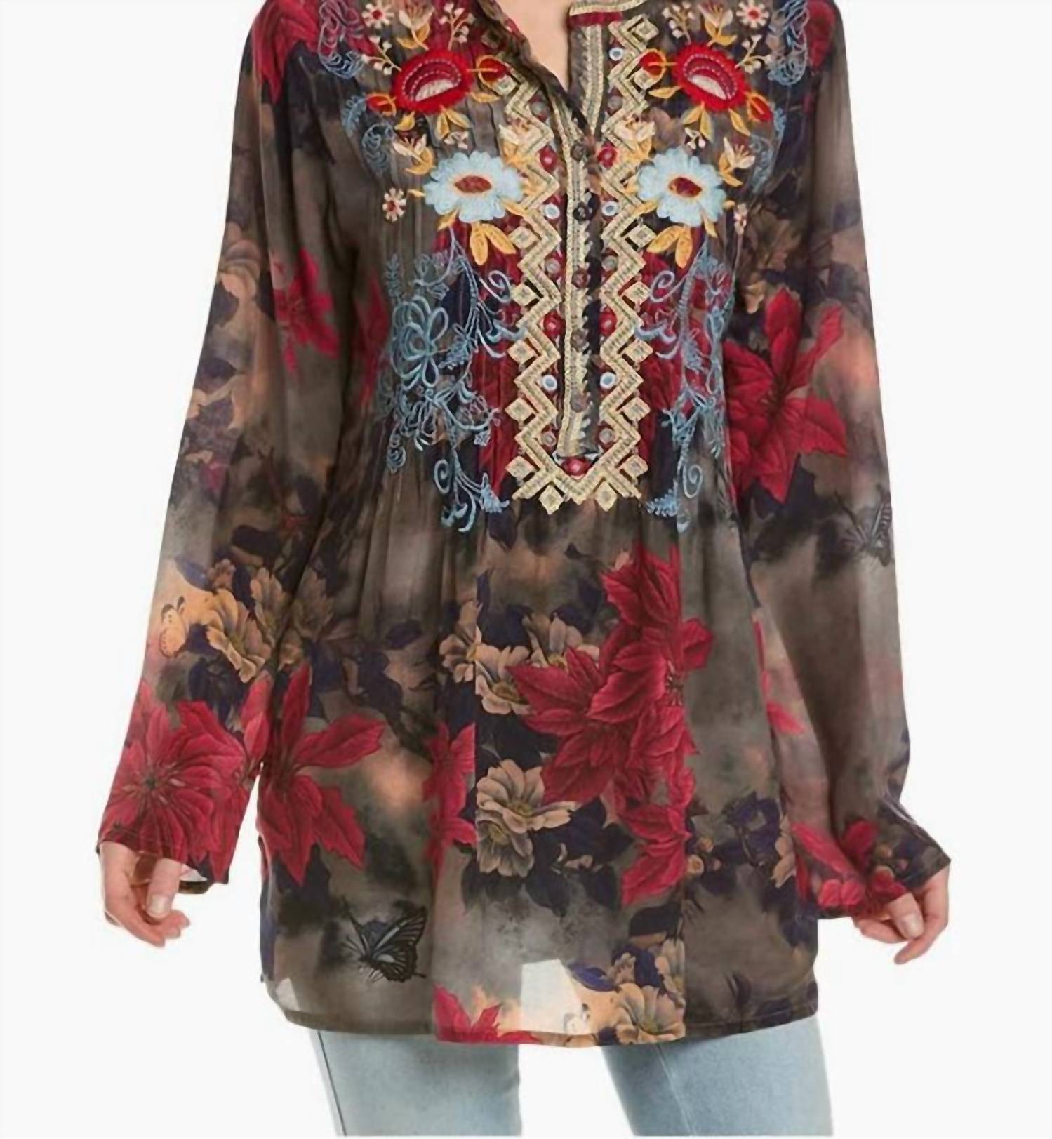 Discover the versatile charm of this tunic blouse, designed with both layering and standalone wear in mind. Its flattering silhouette and stylish details make it a closet essential. Indulge in the Claret Nephele Tunic by Johnny Was, a standout piece featuring long sleeves in a vibrant multicolor pattern. Crafted from luxurious silk, this boho chic tunic exudes elegance with its mockneck design, perfect for a holiday party or Easter celebration. The button closure adds a touch of sophistication and convenience. For care, simply hand wash this exquisite garment to maintain its beauty.