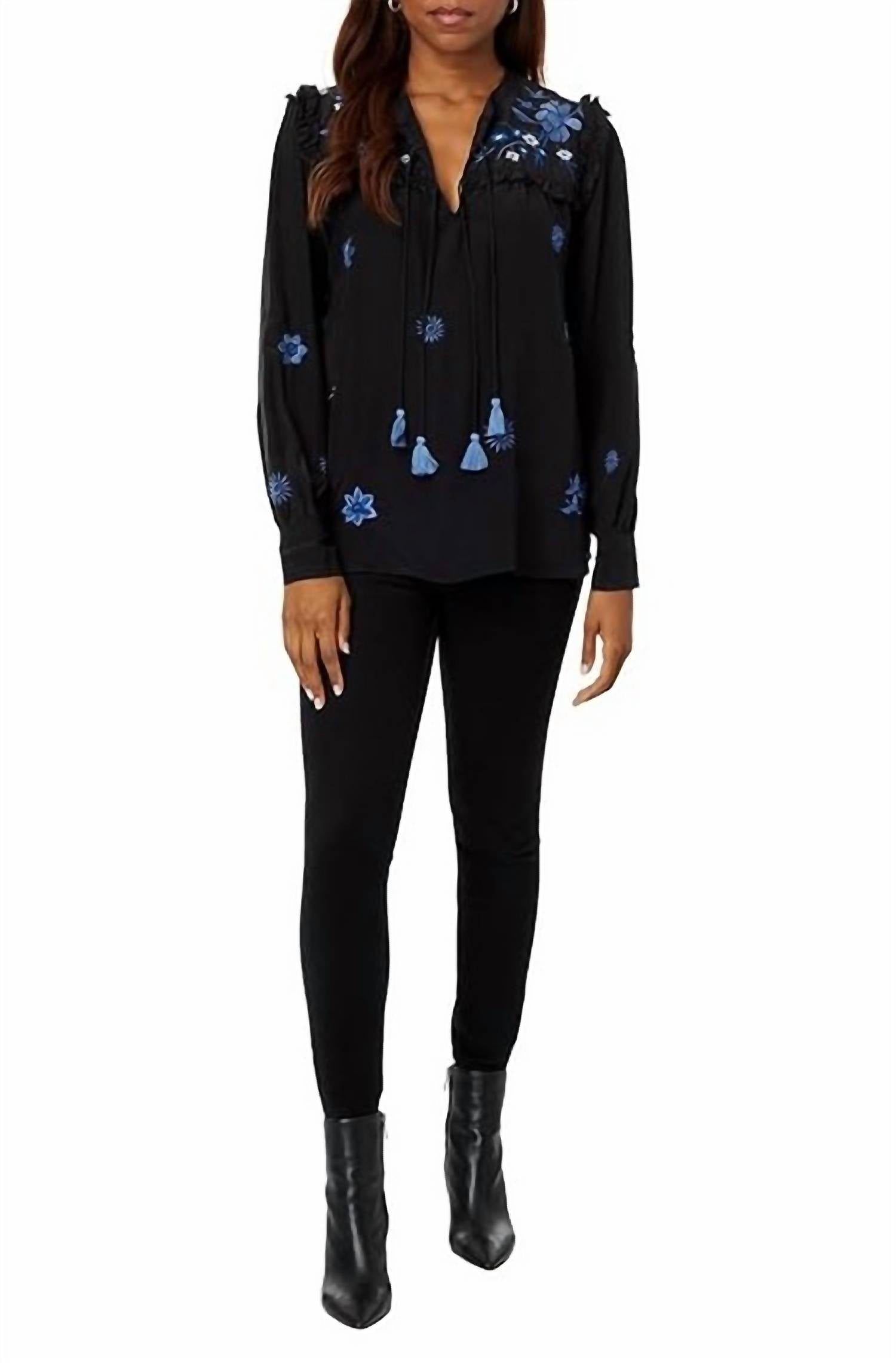 Pair this with your favorite jeans and slides for your next girls night out. Introducing the Jazmine Ruffle Yoke Blouse by Johnny Was, a perfect addition to your summer wardrobe with its boho chic flair. Designed for women, this patterned black blouse features long sleeves and a V-neck for a sophisticated touch. Made from luxurious silk, it offers elegance and comfort for holiday parties or Easter gatherings. Closure: Tie closure.