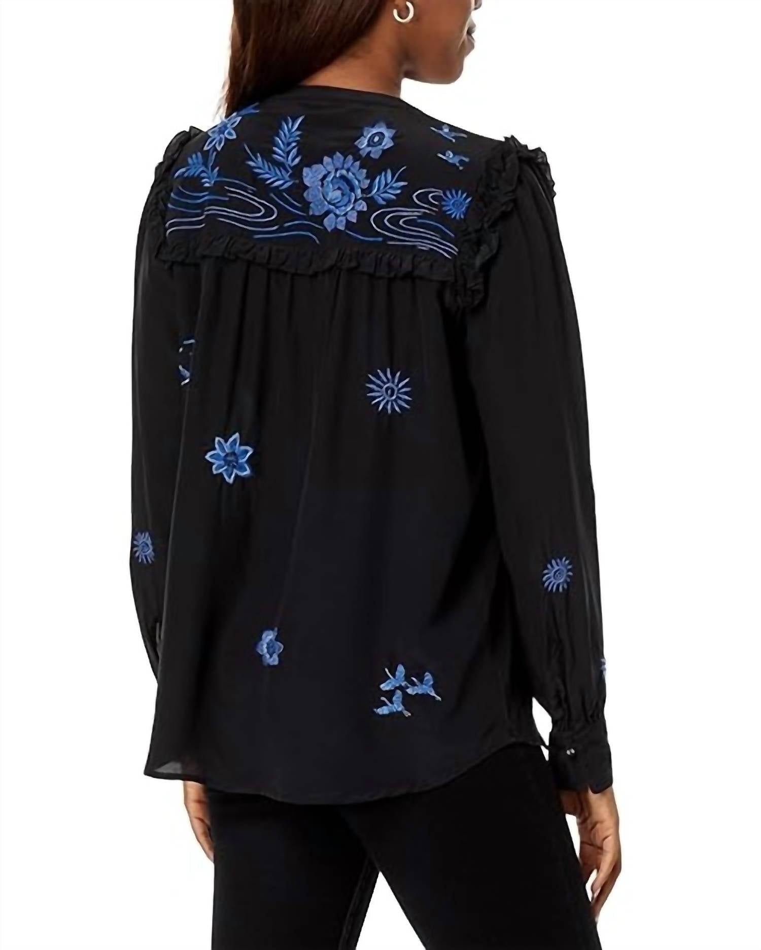 Introducing the Jazmine Ruffle Yoke Blouse by Johnny Was, a perfect addition to your summer wardrobe with its boho chic flair. Designed for women, this patterned black blouse features long sleeves and a V-neck for a sophisticated touch. Made from luxurious silk, it offers elegance and comfort for holiday parties or Easter gatherings. Closure: Tie closure.