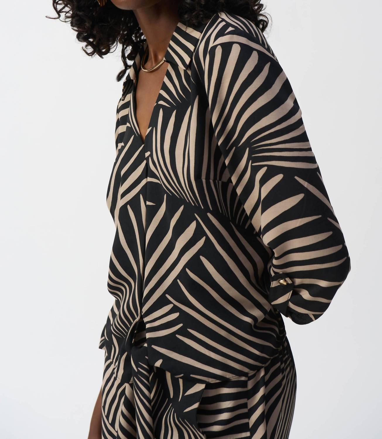 Pair this with your favorite jeans and slides for your next girls night out. Introducing the Gauze Tropical Print Top by Joseph Ribkoff, a chic addition to any wardrobe, perfect for a vacation-ready look. This piece features three-quarter sleeves with tabs and buttons, crafted from 100% polyester gauze fabric and designed in an alluring Black Dune tropical print. The top boasts a V-shaped neckline paired with a shirt collar, complete with a charming front knot at the hem and a subtle snap closure. Care for your garment by hand washing in cold water, avoiding bleach, hanging to dry in the shade, and turning it inside out during washing.