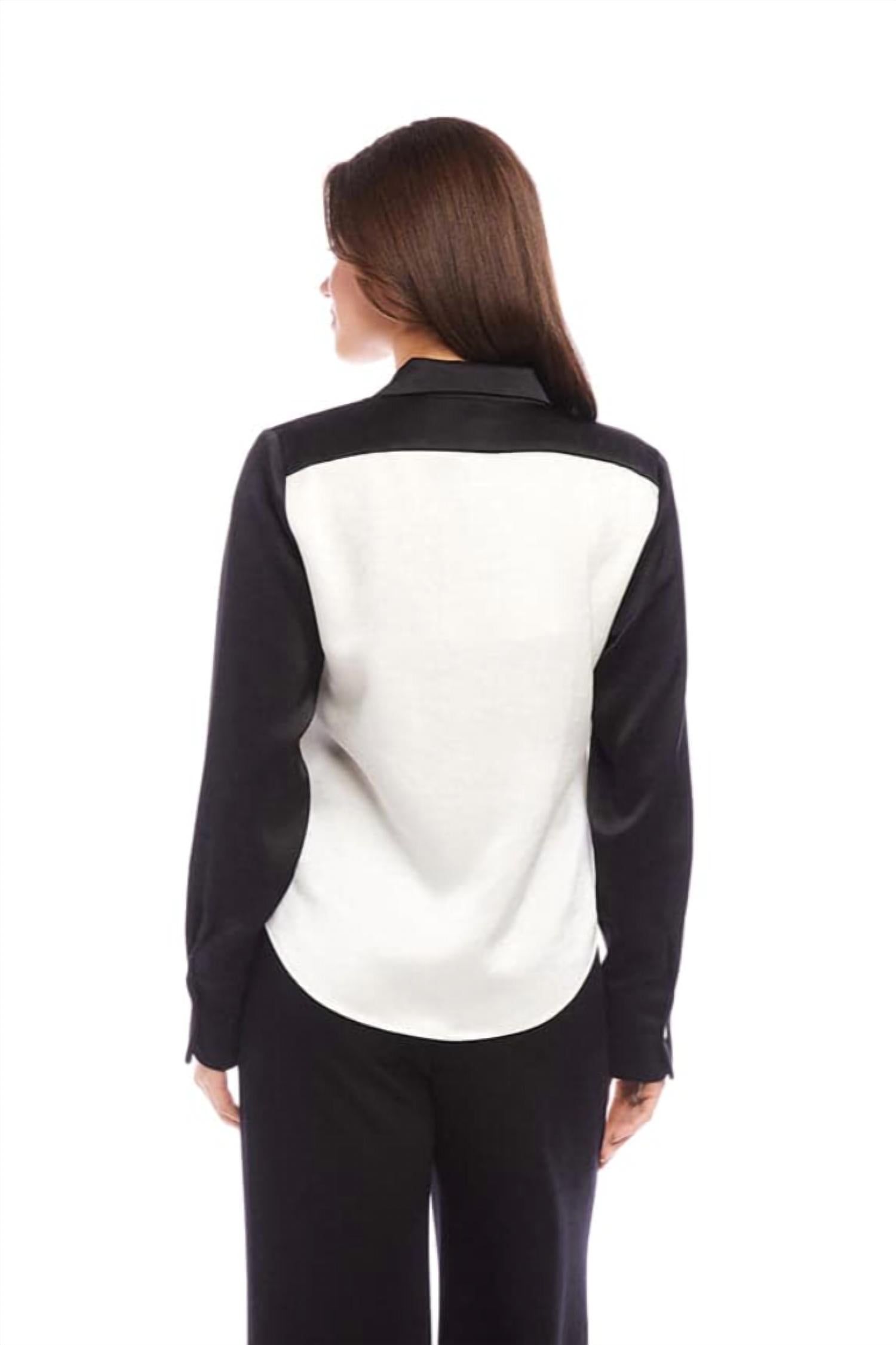 This button down shirt is comfortable yet polished. This colorblock shirt features a collared button-down design with cuffed sleeves and a shirt-tail hem. Adorned with lustrous shell buttons. Made from 55% polyester and 45% recycled polyester. Length: 24.63" (size M). Dry clean only. Made in the USA of imported fabric.