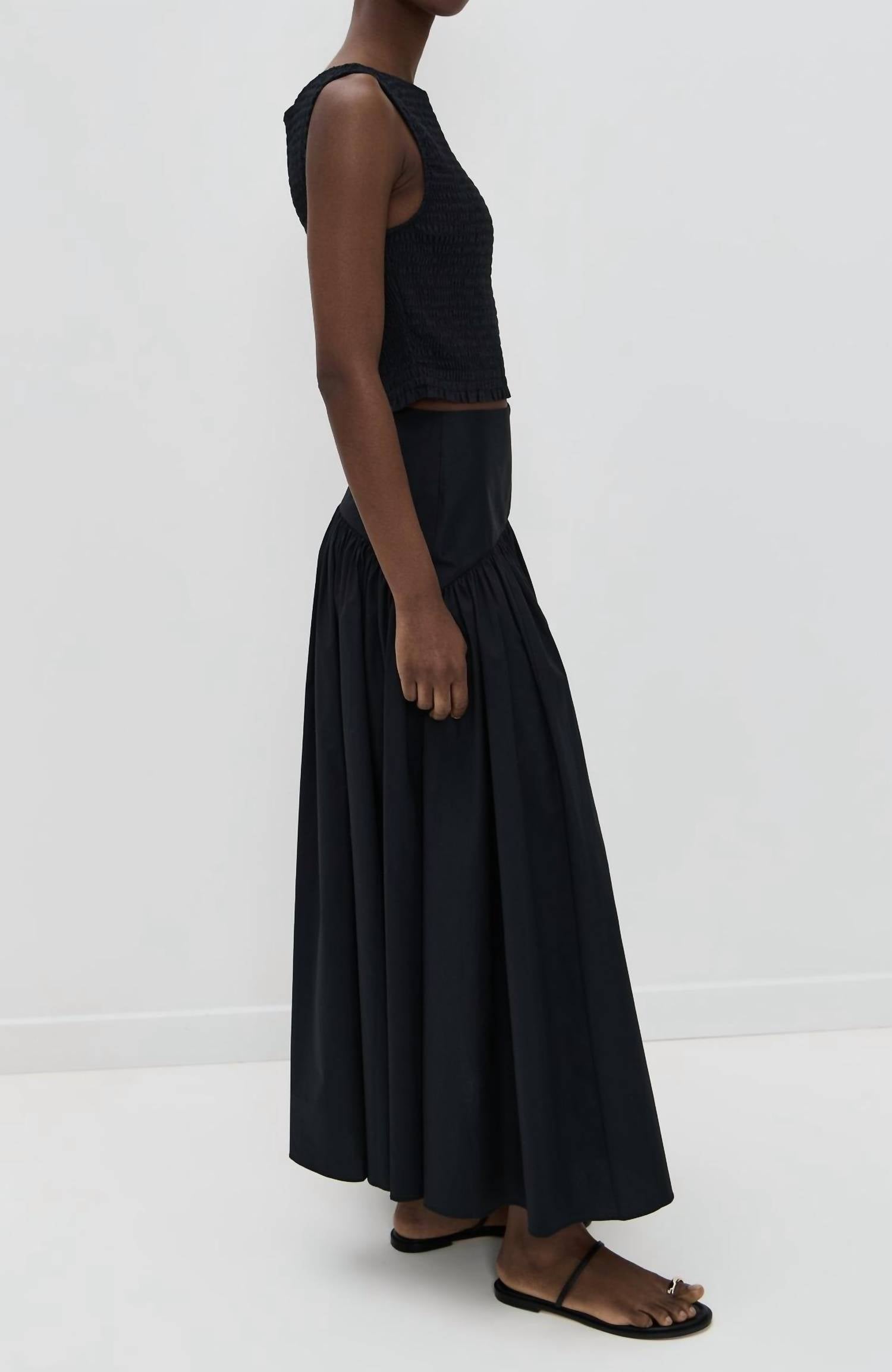 Show a little skin in this cute and casual crop top. Discover the Charlotte Top by Marea, a minimalist and versatile staple in sleek black. This sleeveless crop top is crafted from comfortable cotton, featuring a flattering smocked silhouette and a classic boatneck neckline. It is designed with a delicate keyhole button closure at the back and hits perfectly at the natural waist. Proudly made in China, this piece requires dry cleaning for care. 100% cotton.