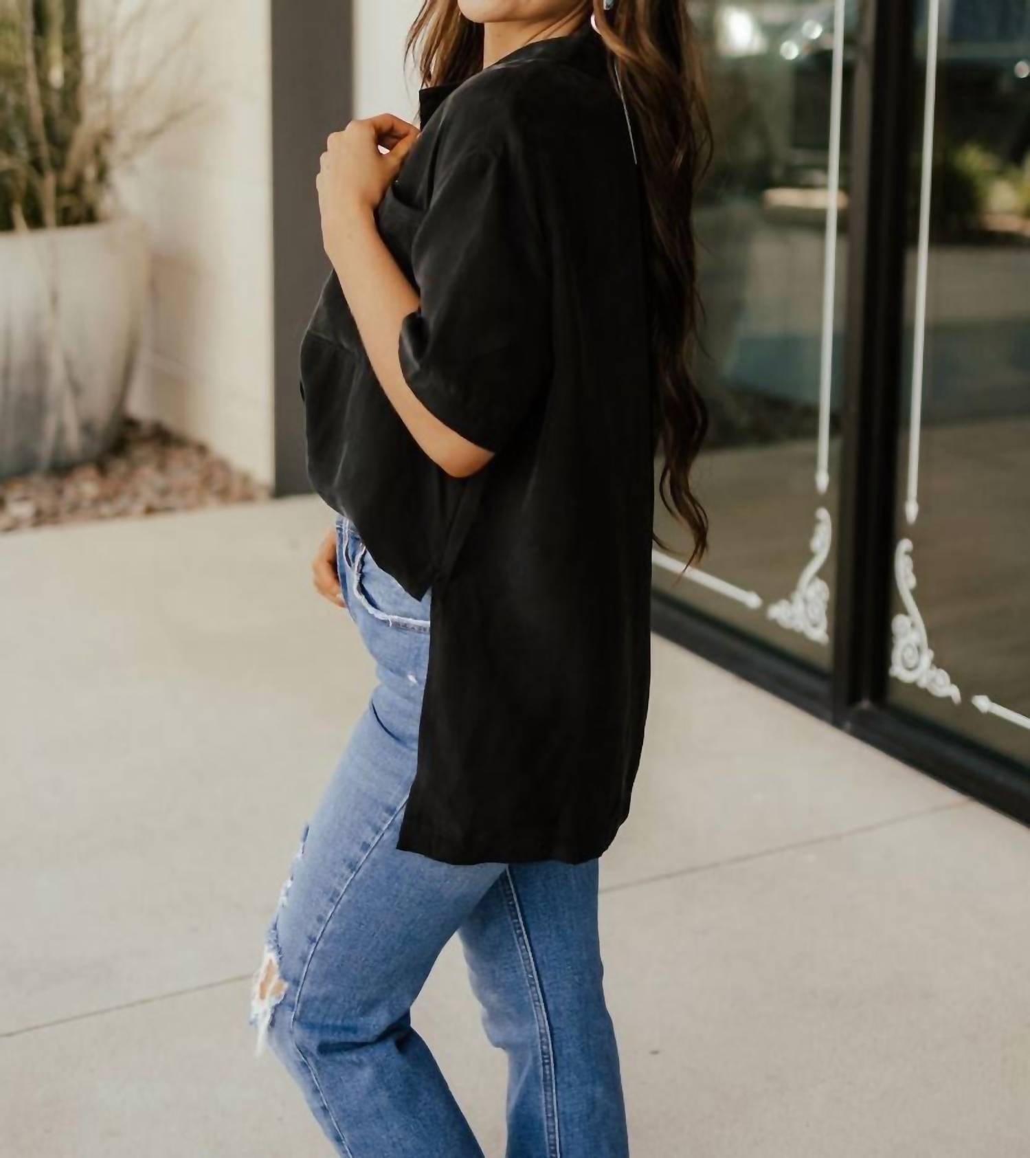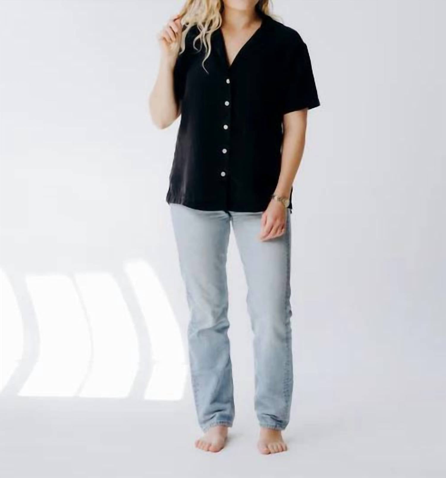 Perfectly tailored and soft to the touch. Elevate your wardrobe with the Margo Paige Camp Button Down Shirt in classic black. This short sleeve top, crafted in the USA, combines 60% cupro and 40% rayon for a luxurious yet breathable and moisture-wicking experience. Featuring a button closure, it boasts a silky, smooth texture that's both versatile and eco-friendly. Care is simple: machine wash cold and lay flat to dry. Available in forgiving sizes XS/S, M/L, and XL/XXL.