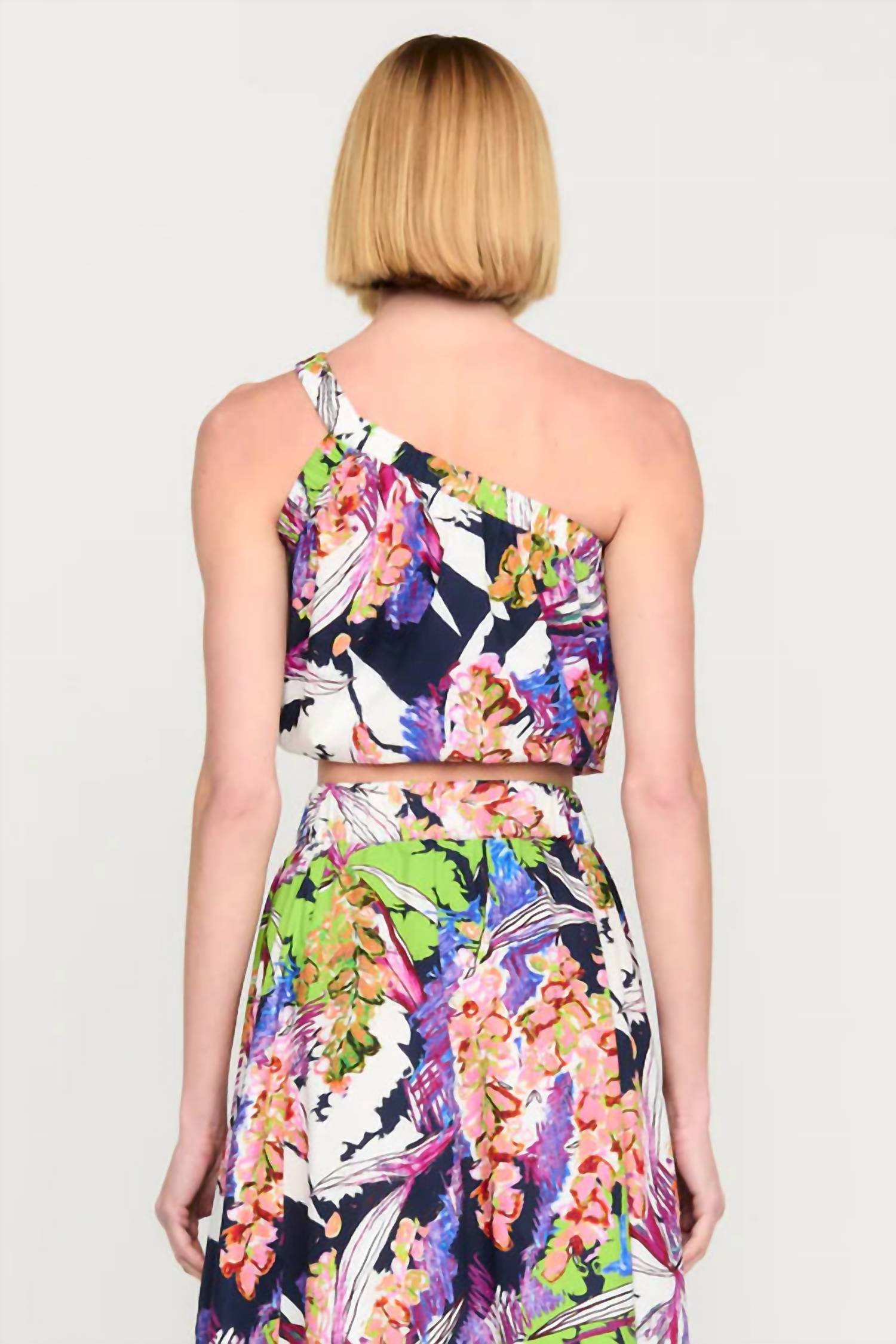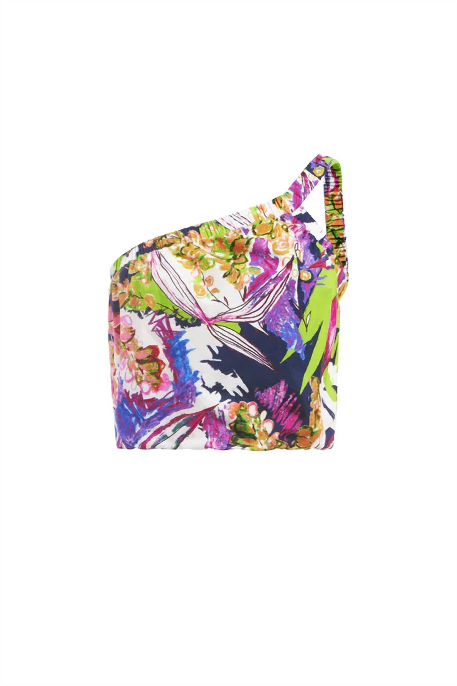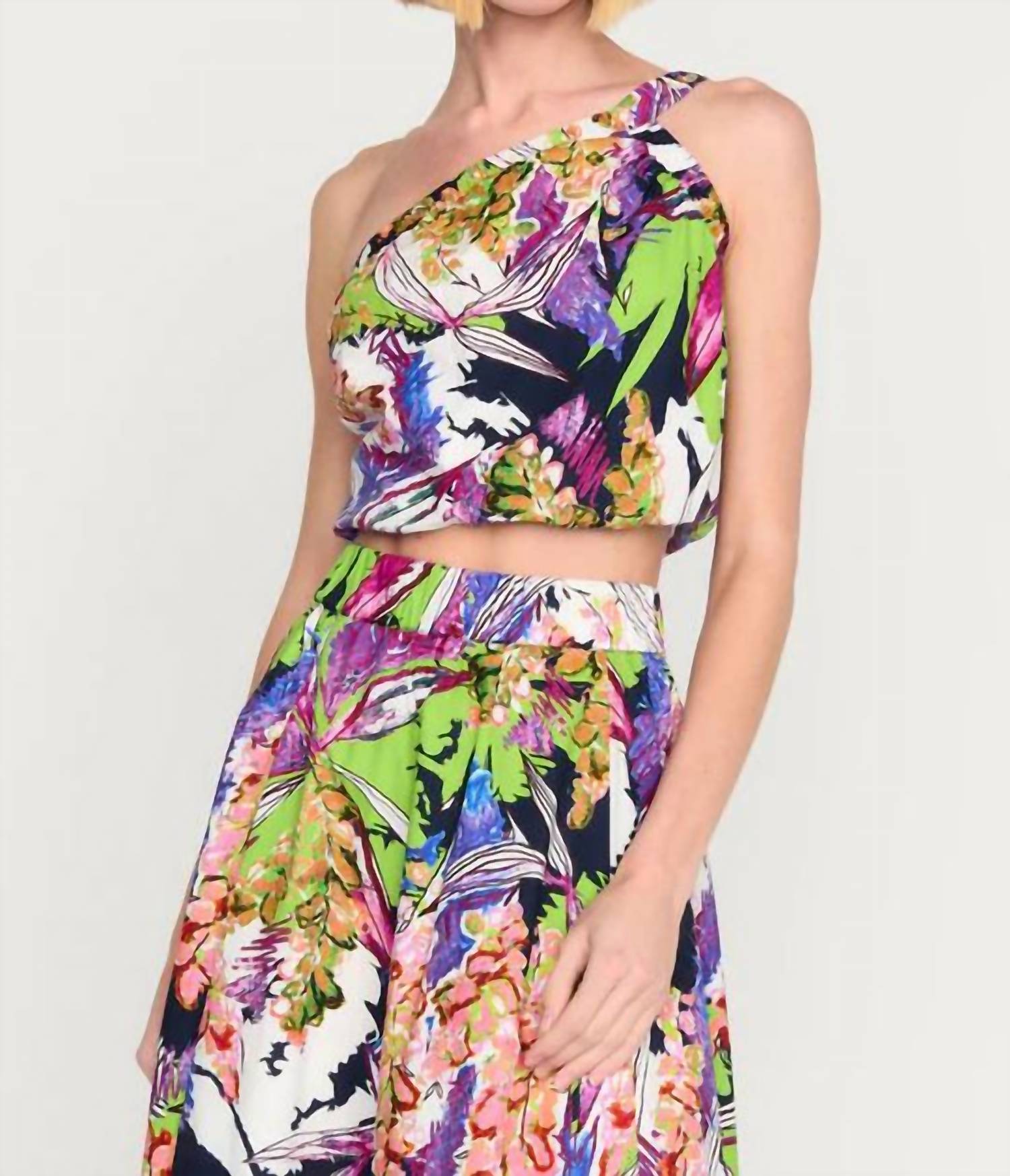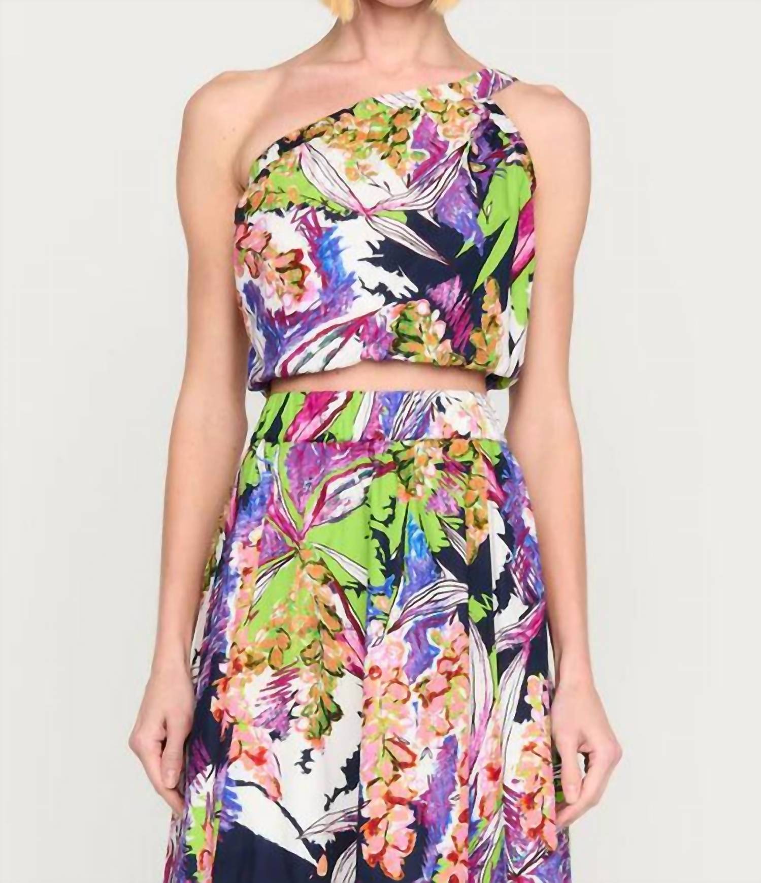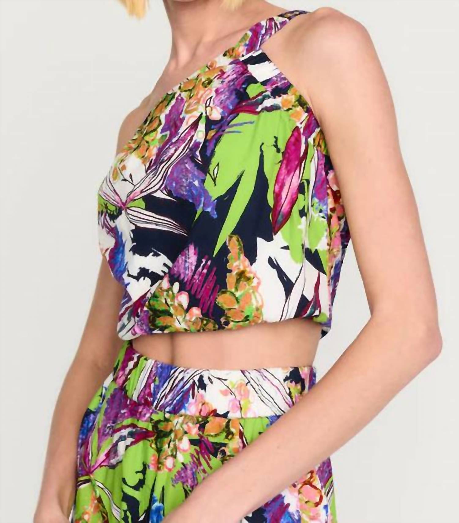 Fit, fabric and functionality. This tank top checks all the boxes. Captivating sleeveless tank with a playful one-shoulder design. Cropped fit is adorned with a vibrant tropical print. Made from 100% Cotton. Features a slip-on silhouette with an elastic neck. Lined for added comfort. Dry clean or use a gentle machine wash cycle and hang to dry.