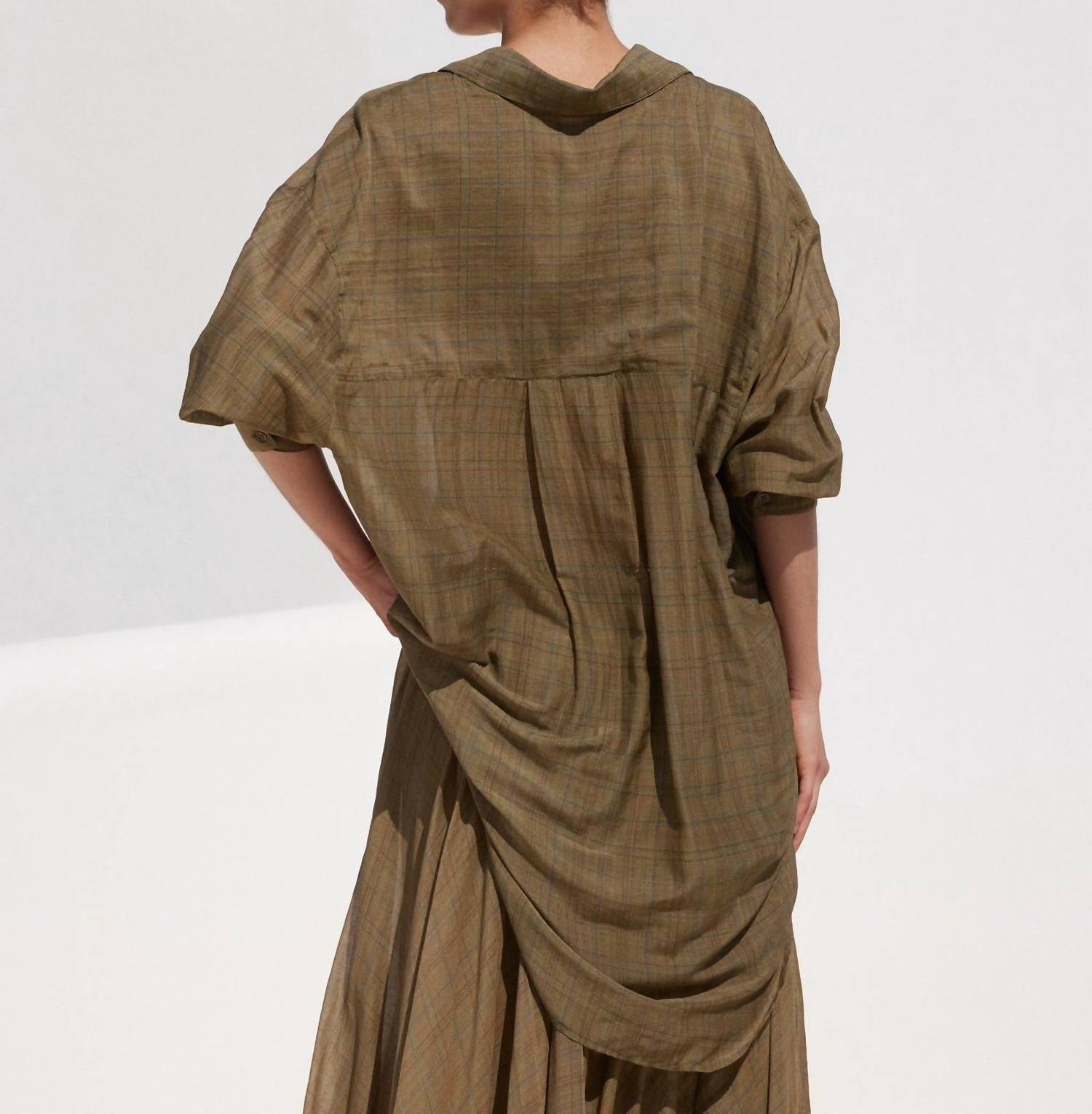 This button down shirt is comfortable yet polished. The Mes Demoiselles Brunello Button Up Shirt offers an elegant synthesis of style and versatility. This khaki button-down shirt features long sleeves with button cuffs and a classic collar, perfect for layering and tying at the front. Made from a luxurious blend of 85% cotton and 15% silk, it boasts a delicate English check print and a slightly transparent, oversized fit for a relaxed look. Care is simple with hand washing advised, while ironing should be done gently to maintain its texture.