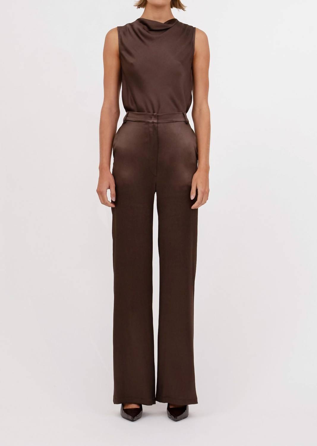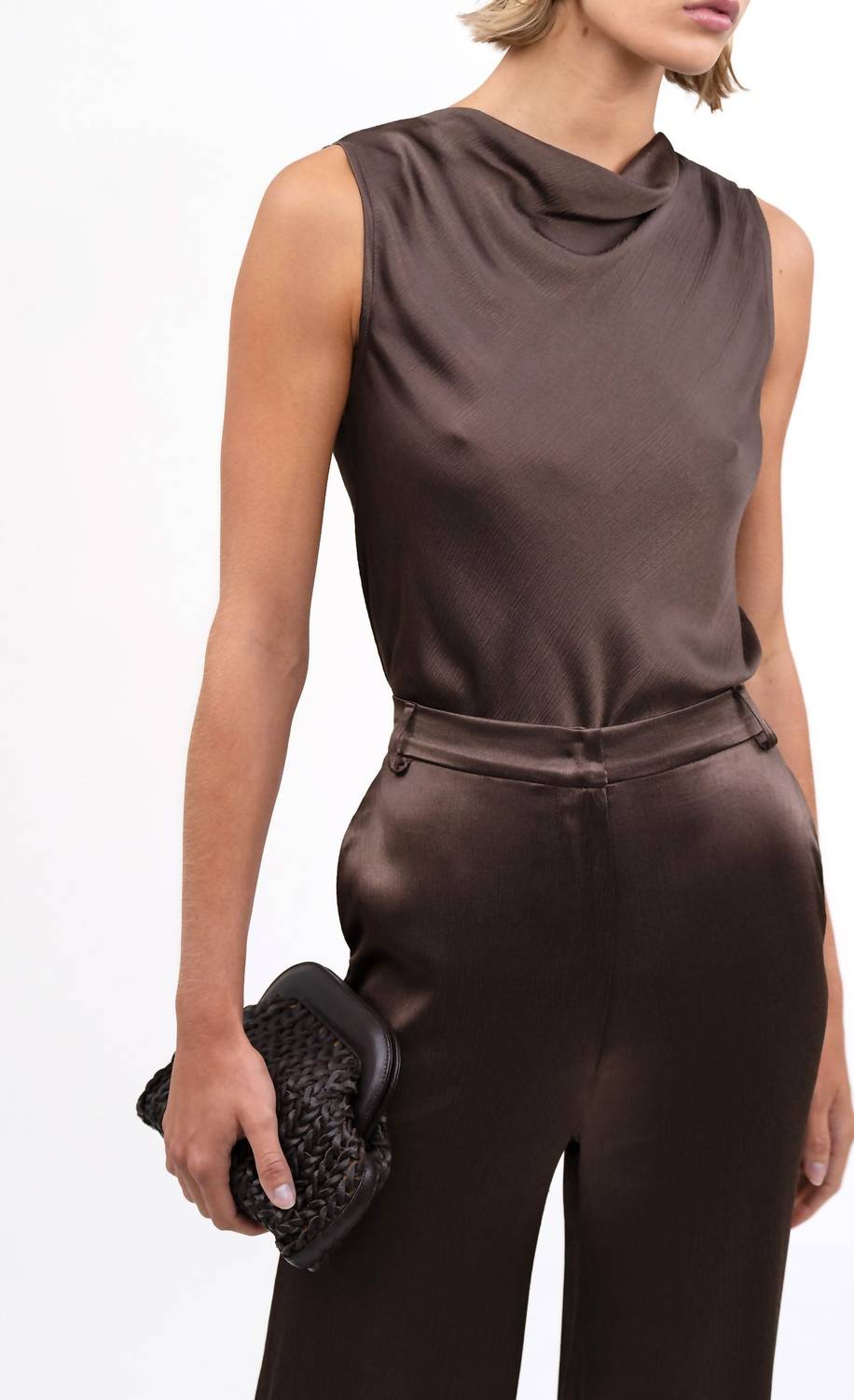 A versatile blouse that works from desk to dinner! Meet the Maisy Sleeveless Top by Nonchalant Label, a stunning piece in a rich chocolate hue and crafted for effortless elegance. This blouse features a chic cowlneck and ruched detailing, ideal for summer engagements or Thanksgiving gatherings. Its solid pattern and button closure add to its versatile vibe, enhancing its transition from day to night effortlessly. Although care instructions are unspecified, the Maisy Top makes a sophisticated statement, perfectly suited for any elegant occasion.