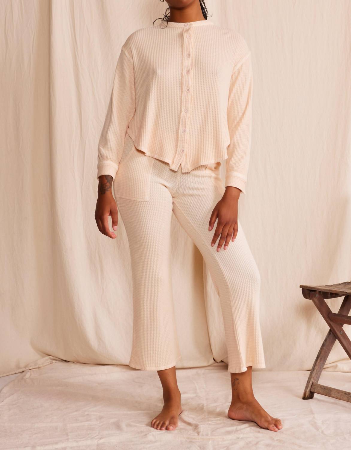 A classic button down shirt that will never go out of style. Discover the Quinn Waffle Top by People of Leisure, a sustainable choice for the eco-conscious traveler. This long sleeve shirt features 98% hemp and 2% spandex for a comfortable, textured feel. Closure is a classic button down style, with a chic crewneck and minimalistic appeal in ecru. Care for this unique piece with machine wash and low tumble dry to maintain its charm.