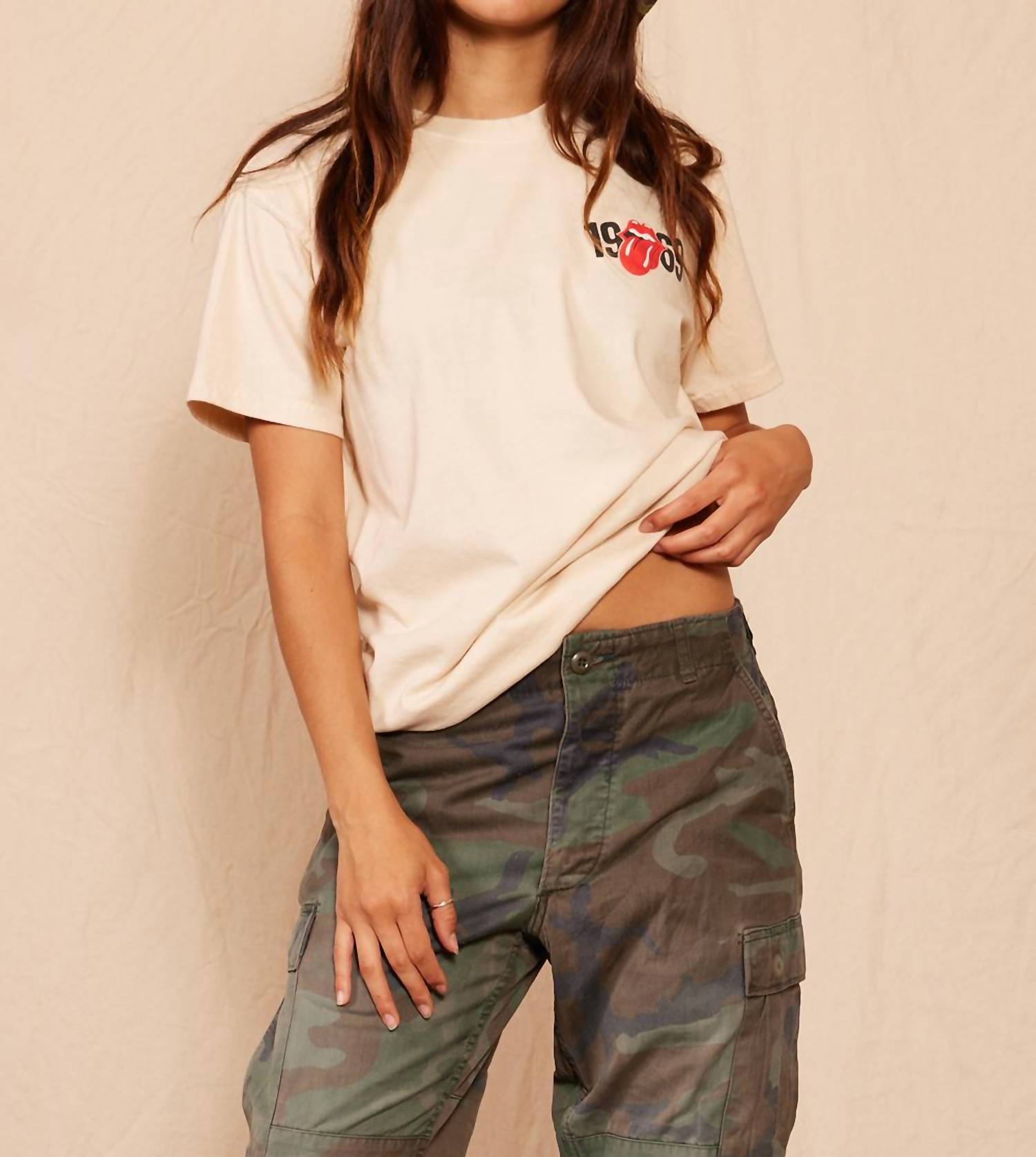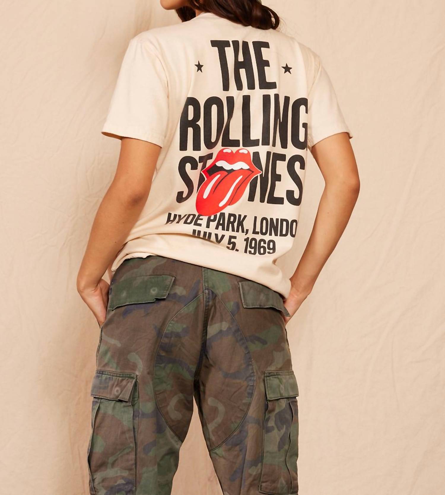 Look no further, you just found your perfect tee! Celebrate rock history with the Rolling Stones London 1969 Tee by People of Leisure, the ideal choice for music enthusiasts and style aficionados alike. Crafted with short sleeves from 100% organic cotton, this sepia tee features striking front and back graphics, paying tribute to the legendary band's comeback show. Enjoy the ethically made quality from Los Angeles, with a pull-on design that ensures comfort and ease. Care: Machine wash cold/warm, tumble dry on low. Available in sizes XS-XL.