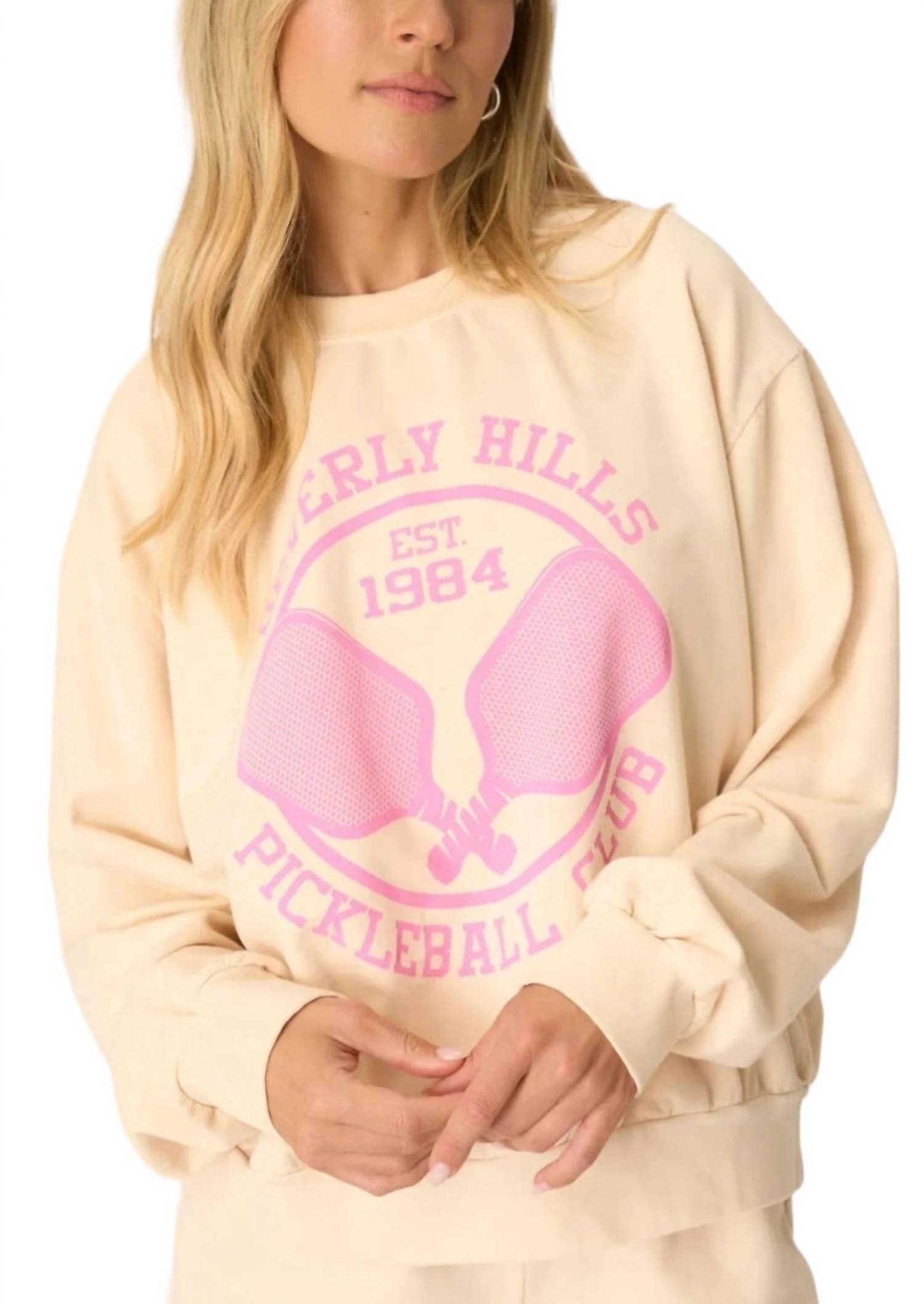 Cooler temps call for layering and we love this adorable sweatshirt for all the obvious reasons. The Project Social T Pickleball Sweatshirt. Inspired by a collegiate aesthetic, this chalk-colored sweatshirt features a playful pink graphic. Made with baby French terry fabric, it combines comfort with a sporty and girly look. 82% Cotton, 13% Polyester, and 5% Spandex. Machine wash cold, inside out with similar colors.