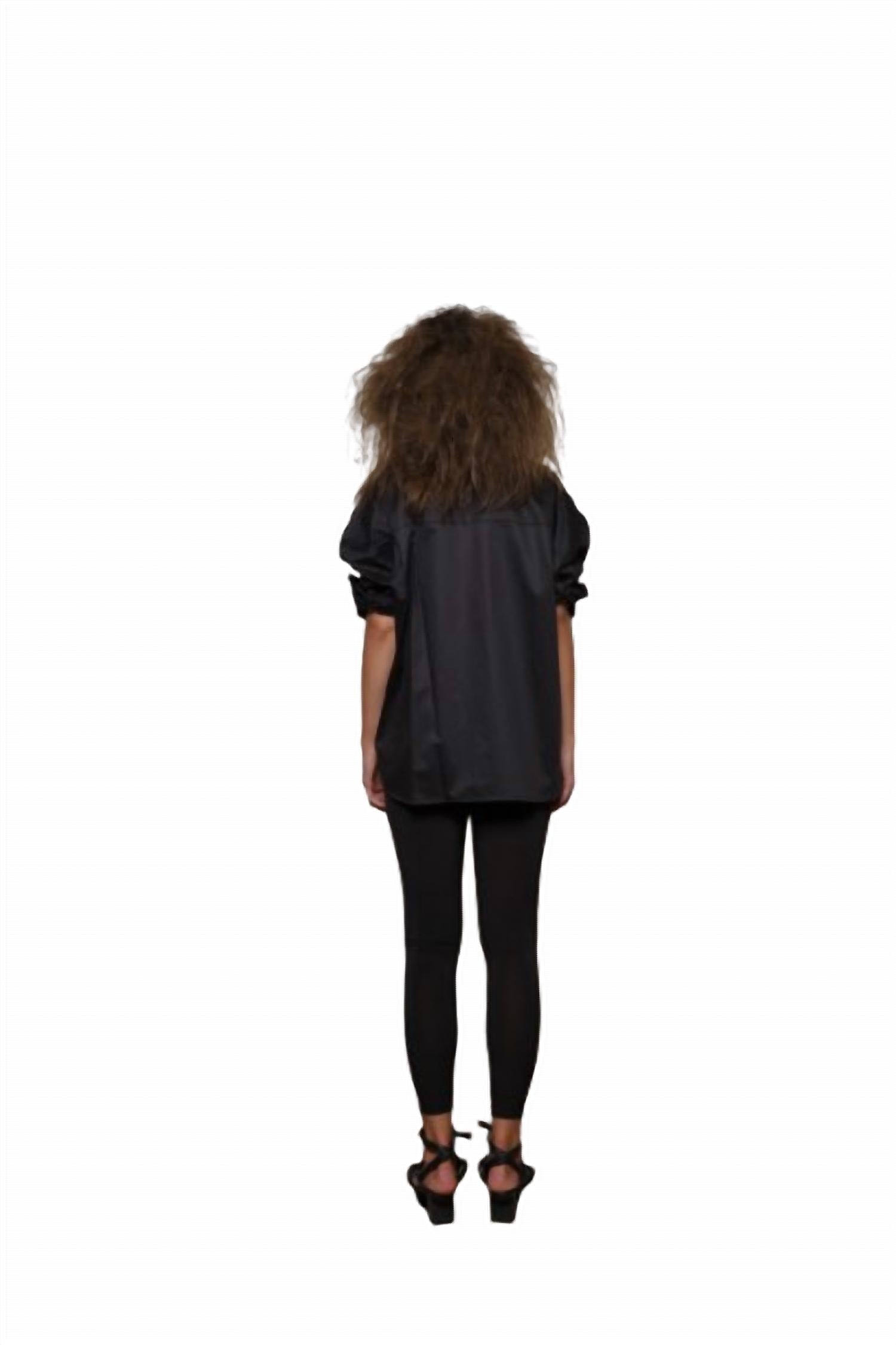 This button down shirt is comfortable yet polished. Introducing the 2 Tone Boxy Shirt by Simply Mila, a fashion-forward piece in a high-contrast black and white palette designed to make a bold statement. This women's shirt features three-quarter dolman sleeves, a relaxed silhouette, and an asymmetric color block detail. Made from 100% cotton in the USA, its design is highlighted by a pointed collar, button closure, and slightly longer back hem for added coverage. Care for this stylish workwear staple is effortless with machine wash and tumble dry. Available in sizes XS to XL with bust measurements ranging from 52" to 60".