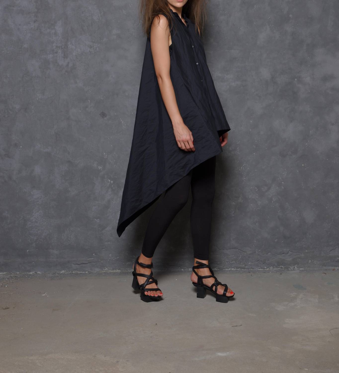 The Sleeveless Asymmetrical Tunic by Simply Mila is a bold addition to any wardrobe, perfect for an evening event. Crafted from a unique blend of Viscose, Cotton, and Metallic Thread, it showcases a modern silhouette with an edgy handkerchief hem. The tunic, made in the USA, features a button closure and is designed in a chic solid black that pairs effortlessly with sleek bottoms. Care for your tunic by machine washing it inside out on a cold, delicate cycle and air drying it. Available in XS with a bust of 36" and a front length of 33", this tunic offers a stunning presence in a rich crinkle finish.
