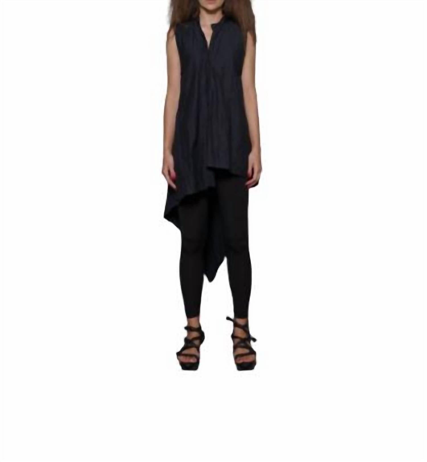 Embrace the versatility of this tunic-style blouse, expertly crafted for seamless layering or perfect to wear on its own. Its detailed design and comfortable fit make it a perfect addition to any closet. The Sleeveless Asymmetrical Tunic by Simply Mila is a bold addition to any wardrobe, perfect for an evening event. Crafted from a unique blend of Viscose, Cotton, and Metallic Thread, it showcases a modern silhouette with an edgy handkerchief hem. The tunic, made in the USA, features a button closure and is designed in a chic solid black that pairs effortlessly with sleek bottoms. Care for your tunic by machine washing it inside out on a cold, delicate cycle and air drying it. Available in XS with a bust of 36" and a front length of 33", this tunic offers a stunning presence in a rich crinkle finish.