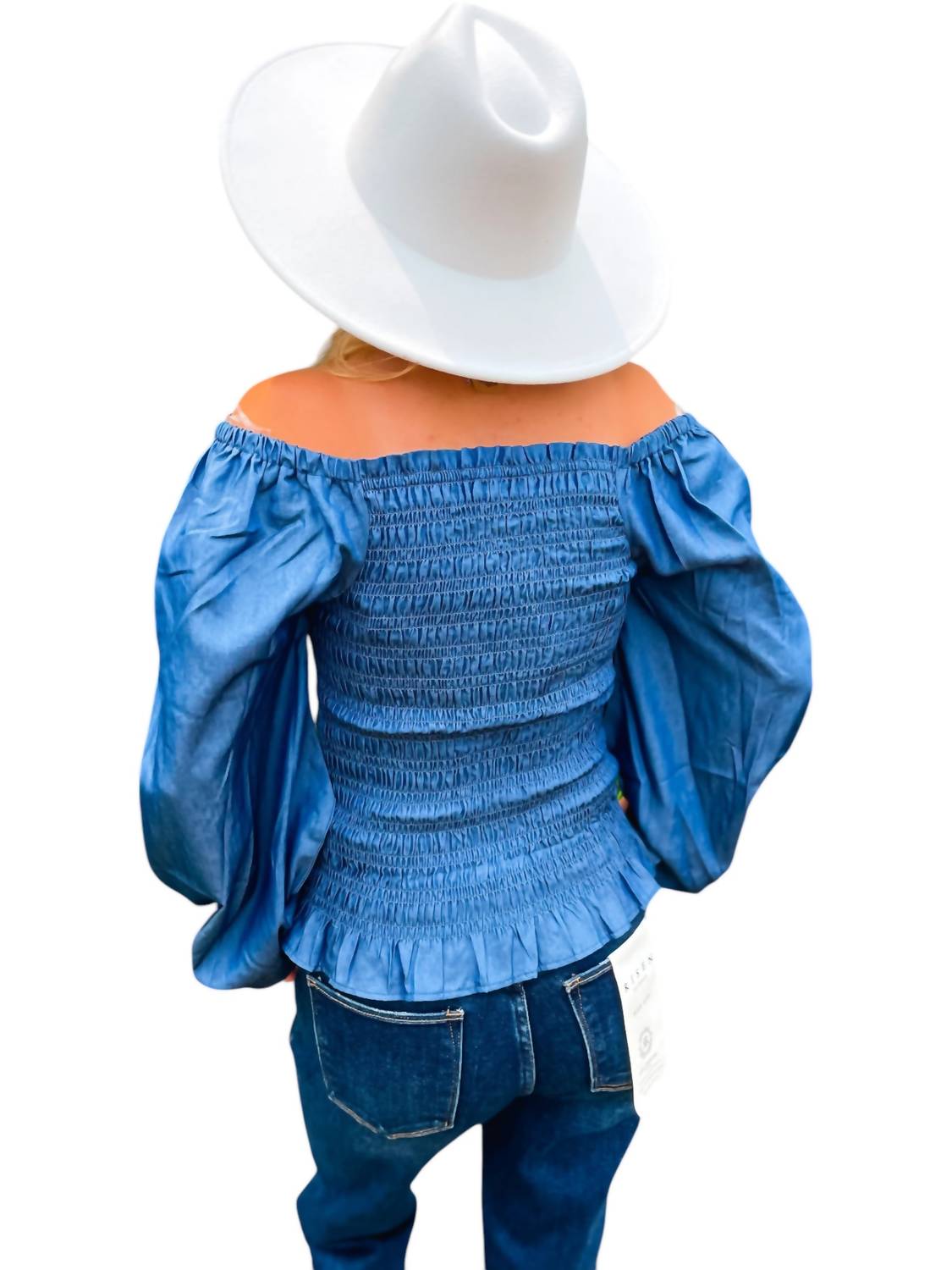 Offers a blend of comfort and style with its off-the-shoulder neckline and 3/4 bubble sleeves for a playful touch. Crafted from a composition of 75% tencel and 25% polyester. Features a flattering pull-on closure and ruched elastic body for a contoured fit.