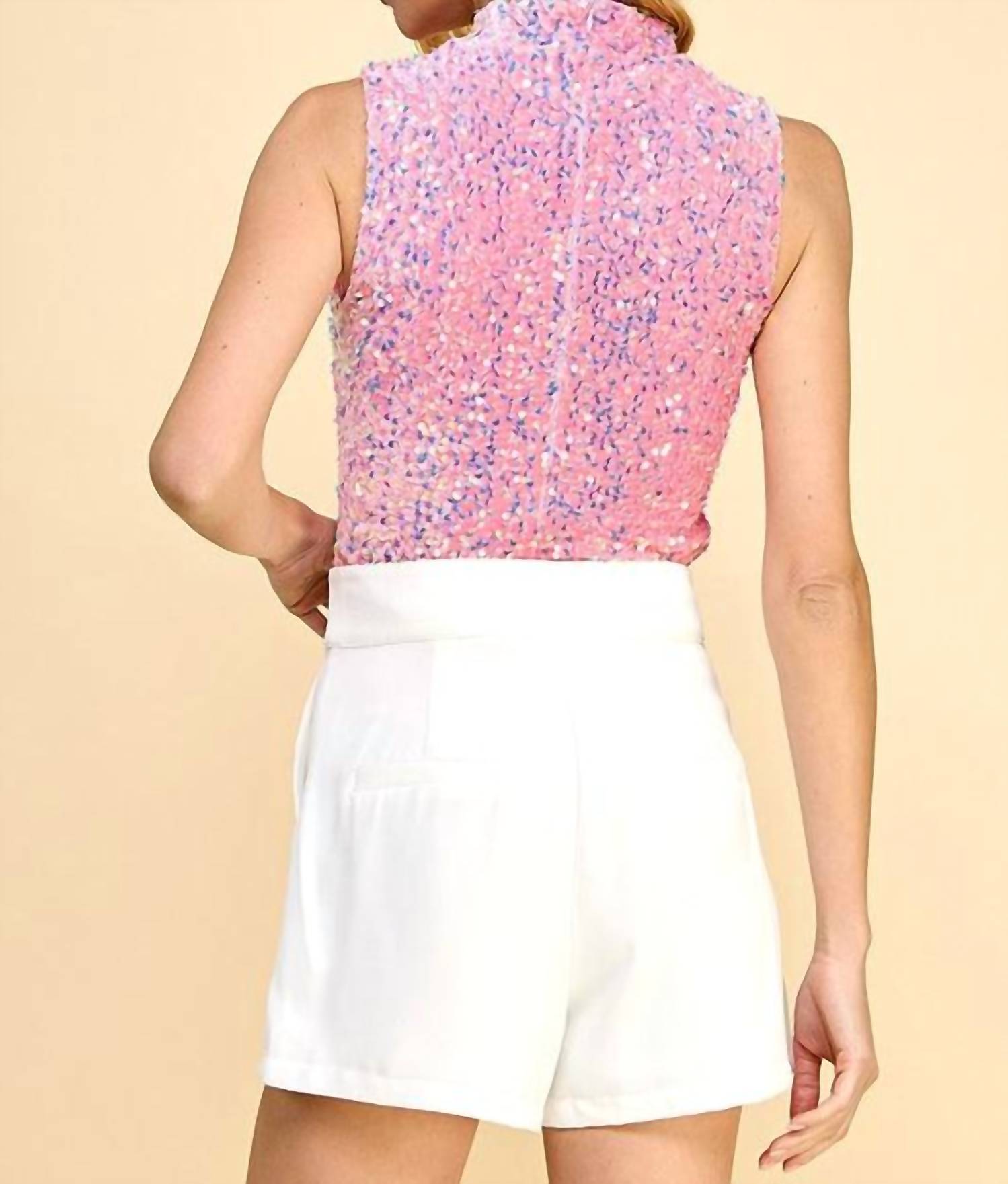 Who doesn't love a good bodysuit? Make a statement this holiday season with the TCEC All That Glitters Sequin Bodysuit in stunning pink. This sleeveless bodysuit features a mockneck design, crafted with eye-catching sequins and luxurious velvet. Its sleek silhouette is enhanced by a concealed back zip closure for a seamless finish. Perfect for New Year's Eve or any festive occasion, this textured masterpiece fits like a dream. Model is 5'9", wearing a dress size 2 (Bust: 33", Waist: 25", Hips: 34").