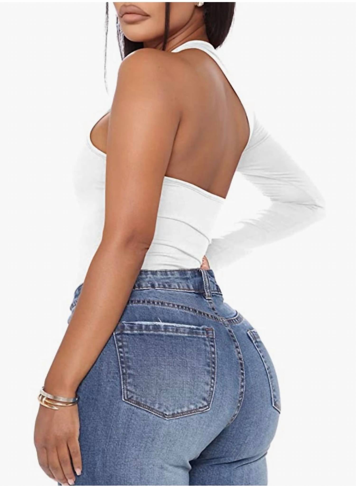 The Karyl Bodysuit by Tob offers a perfect blend of comfort and style with its long sleeves and scoop neckline, ideal for a summer cocktail party. Made from 90% polyester and 10% spandex, this bodysuit is soft, breathable, and stretchy to ensure a comfortable fit. The solid white design embraces Y2k trends, making it a versatile addition to your wardrobe. Care instructions include hand wash in cold water and avoiding bleach for lasting quality. Model wears size small.
