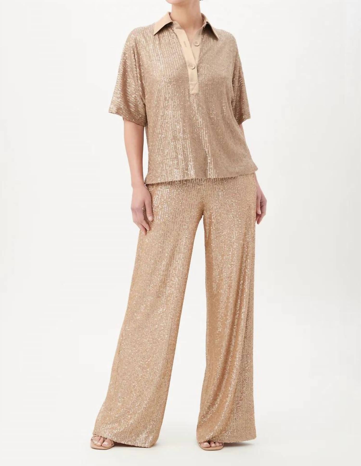 The short sleeve tee you'll want in every color.Short-sleeve top featuring a contrast satin collar and front half placket, a polo-inspired design, and a relaxed fit. Short dolman sleeves. Boxy fit. Mesh: 92% Polyester, 8% Spandex. Sequin: 100% Polyethylene Terephthalate. Dry clean only. Imported.