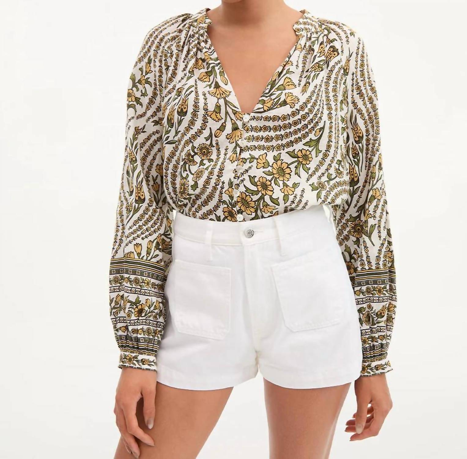 A timeless blouse that will never go out of style. Elevate your wardrobe with the Ailani Top by Veronica Beard, a boho-chic piece in dove multi that's perfect for summer getaways. This blouse features long, romantic blouson sleeves and a deep split V-neck for a relaxed fit. Made from 100% linen, this patterned treasure measures 24.75" in length and has a sleeve length of 31.75" based on a size 2. Closure: Button closure. Care: Dry clean only. Model is 5'10" wearing size 2.