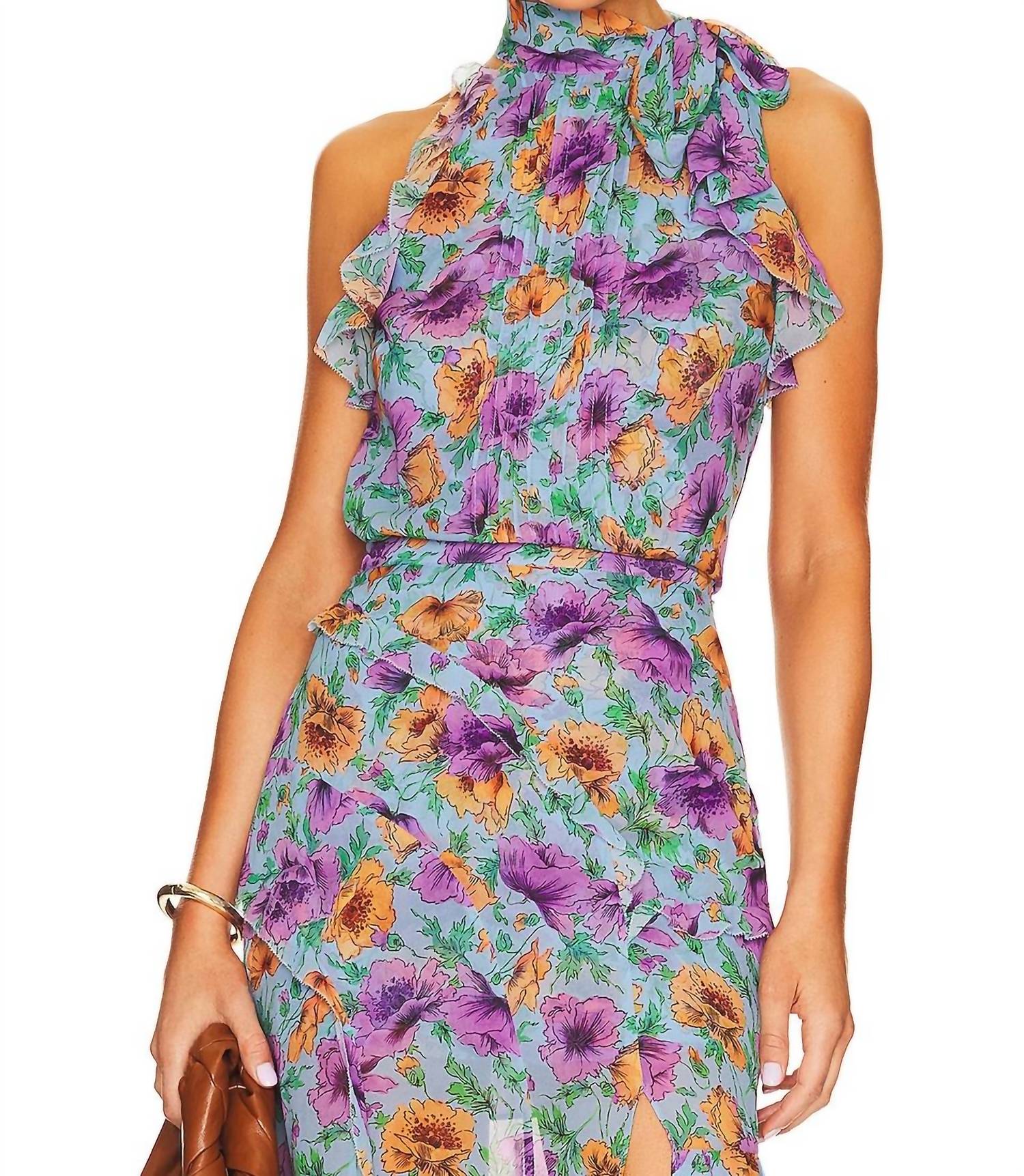 Elevate your style with the Dali Floral Silk Top by Veronica Beard in a captivating Lake Blue hue. This sleeveless blouse is exquisitely crafted from 100% silk with intricate florals, featuring a self-tie halter neckline, pintuck pleats, and elegant frill trims. Made in China, it offers a lining of 100% polyester for added comfort. With a 25" length and a 17.5" pit-to-pit measurement, this piece is perfect for a holiday party or Easter celebration. Care: Dry clean only.