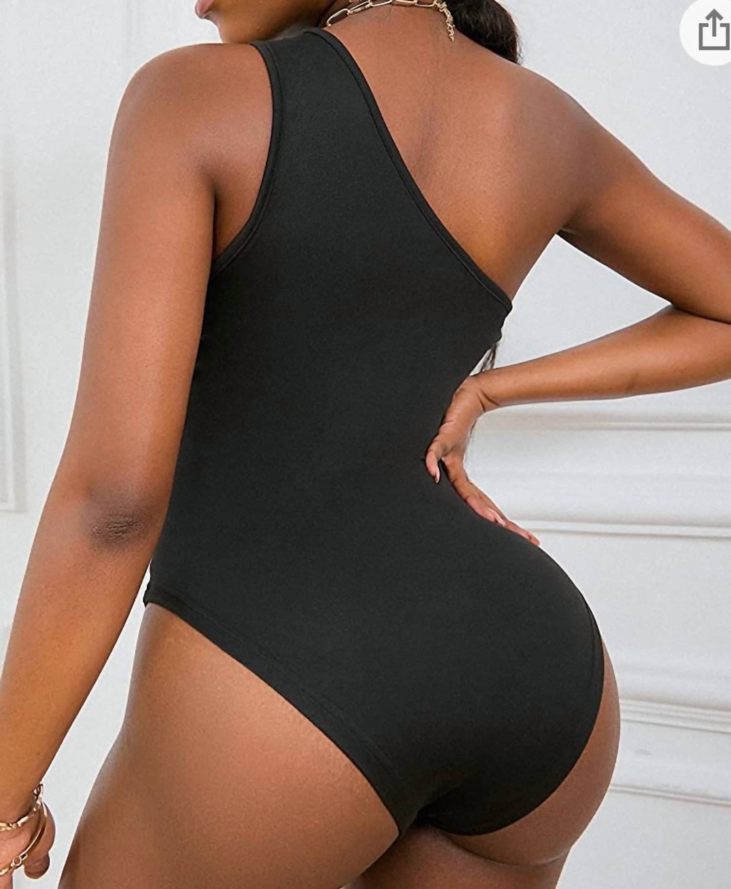 Who doesn't love a good bodysuit? Unveiling the Jackie Cut Out Bodysuit by Wdirara, a striking piece perfect for cocktail parties and weekend outings. This sleeveless bodysuit features an asymmetrical neck with a trendy one-shoulder design and seductive cut-outs, crafted in a soft and stretchy fabric for unbeatable comfort. This solid black piece offers a cheeky swim coverage with a bikini bottom style. Available sizes include bust measurements of 28.7 inches (X-Small) through 36.6 inches (X-Large), with the model showcasing a size Small.