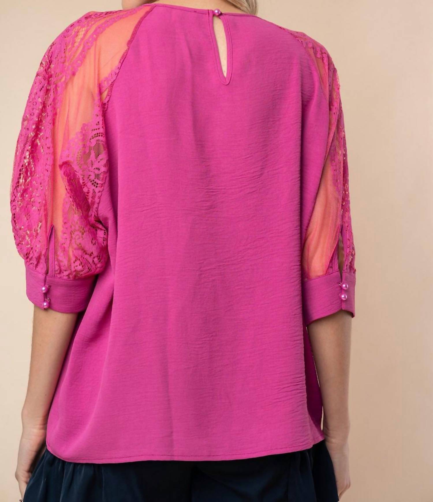 Pair this with your favorite jeans and slides for your next girls night out. Discover the Three-quarter Lace Sleeve Top by White Birch, a charming addition to your spring wardrobe. This blouse features three-quarter sleeves with delicate lace details, offering a loose fit and a crewneck. Crafted from 100% Polyester, it showcases a lightweight woven texture in a true mauve hue. Closure: Button closure. Perfect for housewarming occasions or a romantic Valentine's Day ensemble. Model is 5'10" and is wearing a size Small.