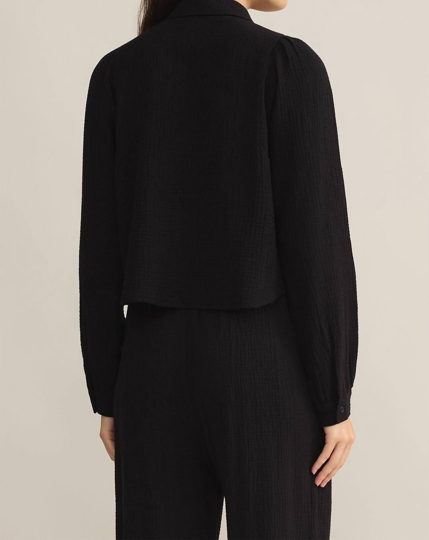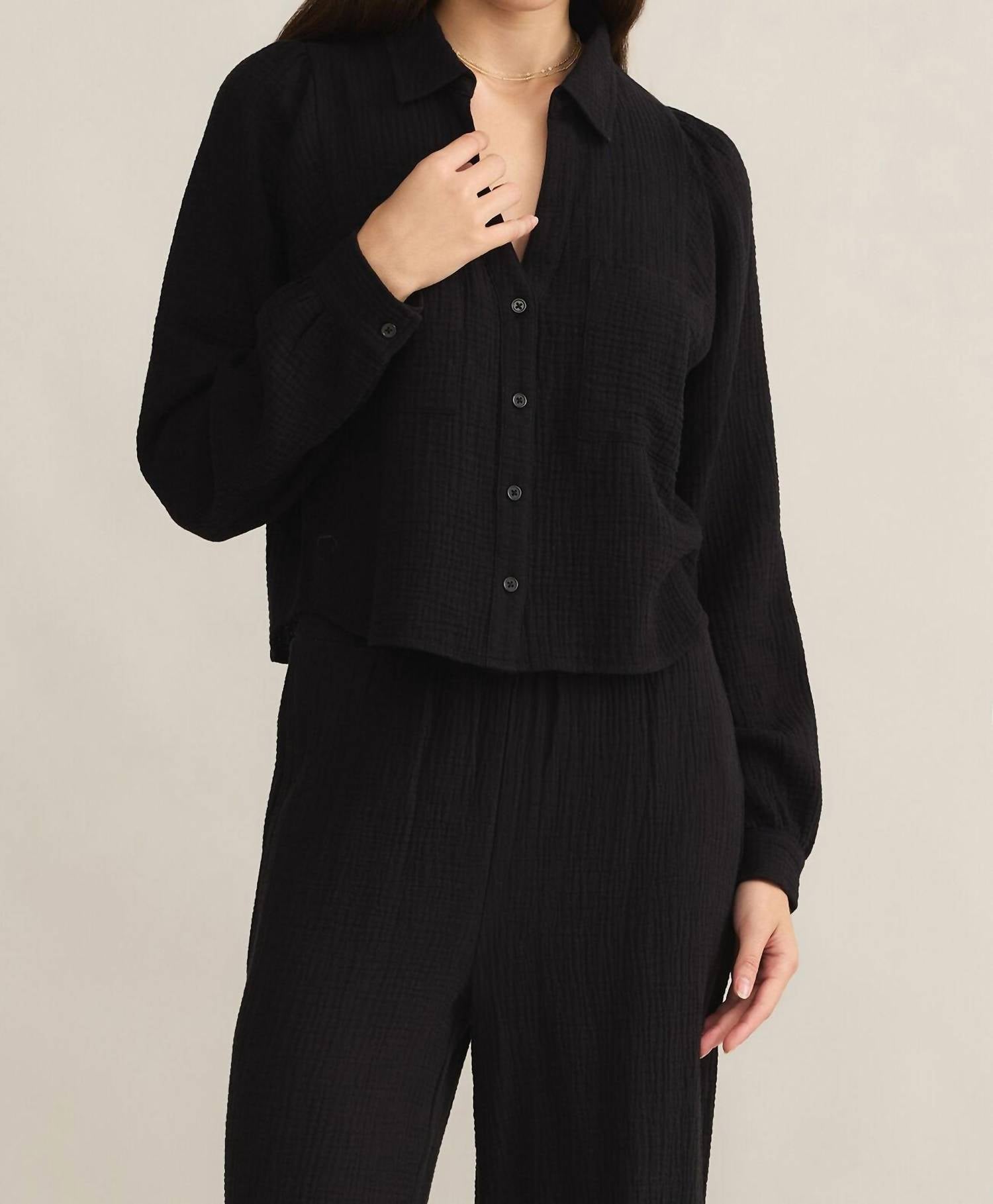 A classic button down shirt that will never go out of style. Introducing the Campo Button Up Gauze Top by Z Supply, a chic piece perfect for any spring occasion or Halloween festivity. Made entirely from lightweight, textured cotton, it features a cropped length and classic long sleeves. Its button closure adds a touch of sophistication, complemented by a practical side chest pocket. Whether layered over your favorite brami or worn solo, this top effortlessly captures the versatile spirit of 90s fashion in a neutral black hue.