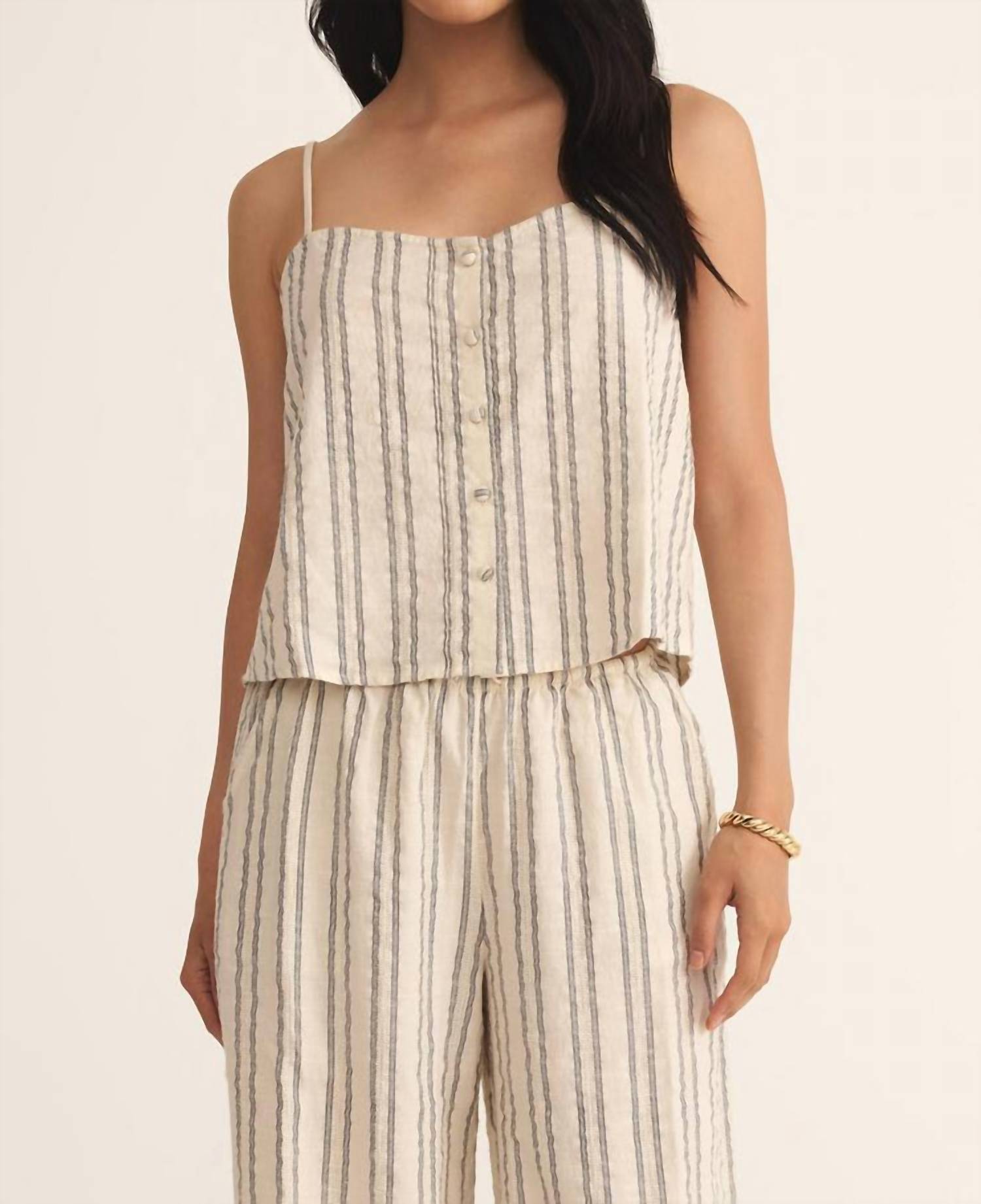 Fit, fabric and functionality. This tank top checks all the boxes. The Savoy Stripe Tank Top by Z Supply offers a relaxed, breezy style perfect for summer with its novelty textured dobby stripe and v-neck design. With spaghetti straps featuring adjustable o-ring sliders and a straight back, it's crafted for both comfort and standout style. Closure: Button closure. Care: Machine wash. 91% Cotton, 9% Polyester.