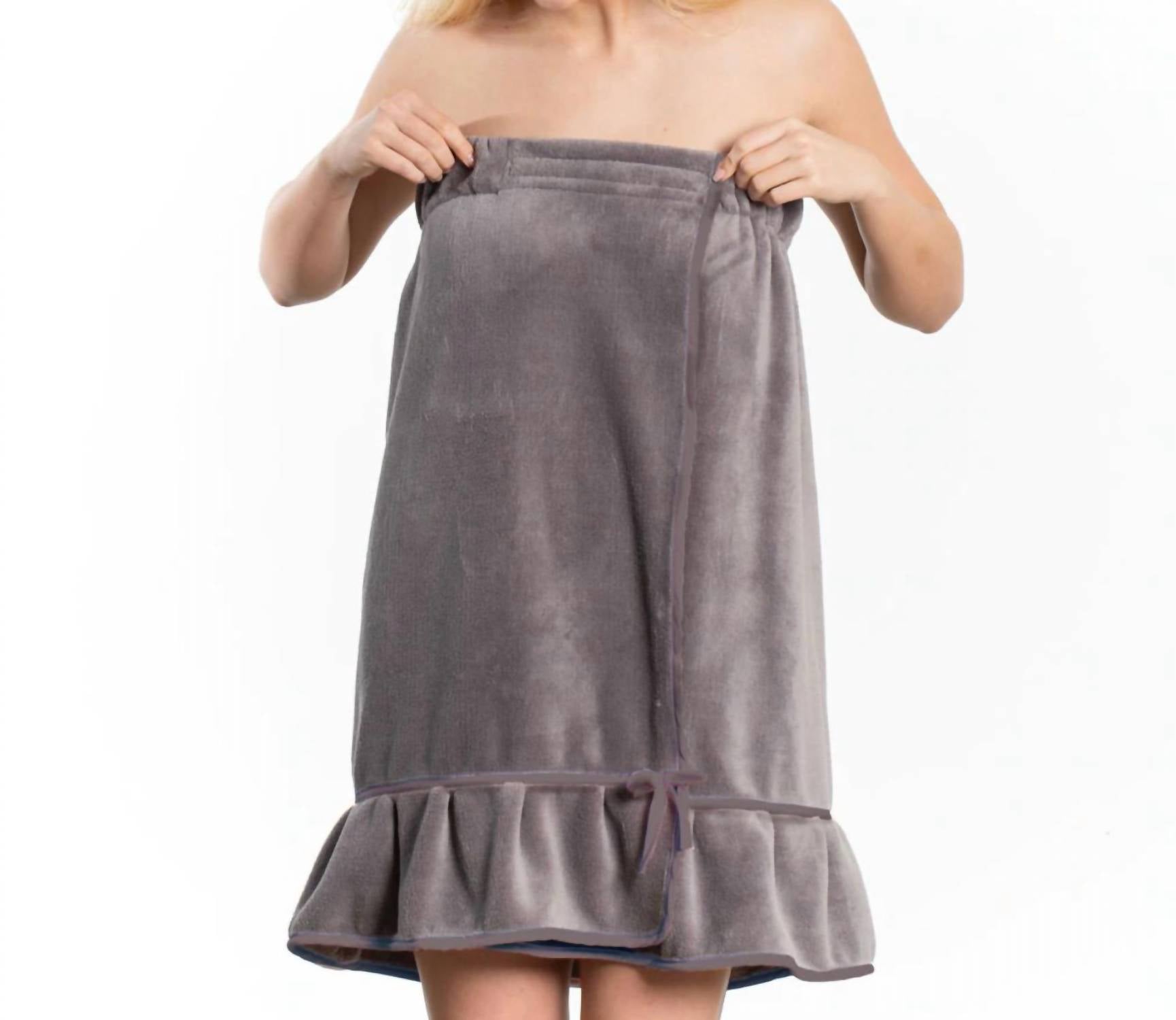 Indulge in the Bella il Fiore Women's Ruffle Spa Wrap, an elegant blend of comfort and style. This strapless wrap, crafted from 100% polyester, offers a plush feel with its ultra-soft fabric and chic ruffle accent. Designed with a convenient Velcro closure and a soft elastic band at the back, it measures 27” in length, fitting US sizes 0-10. Available in a sophisticated gray, this spa wrap is machine washable and can be tumble dried for easy care.