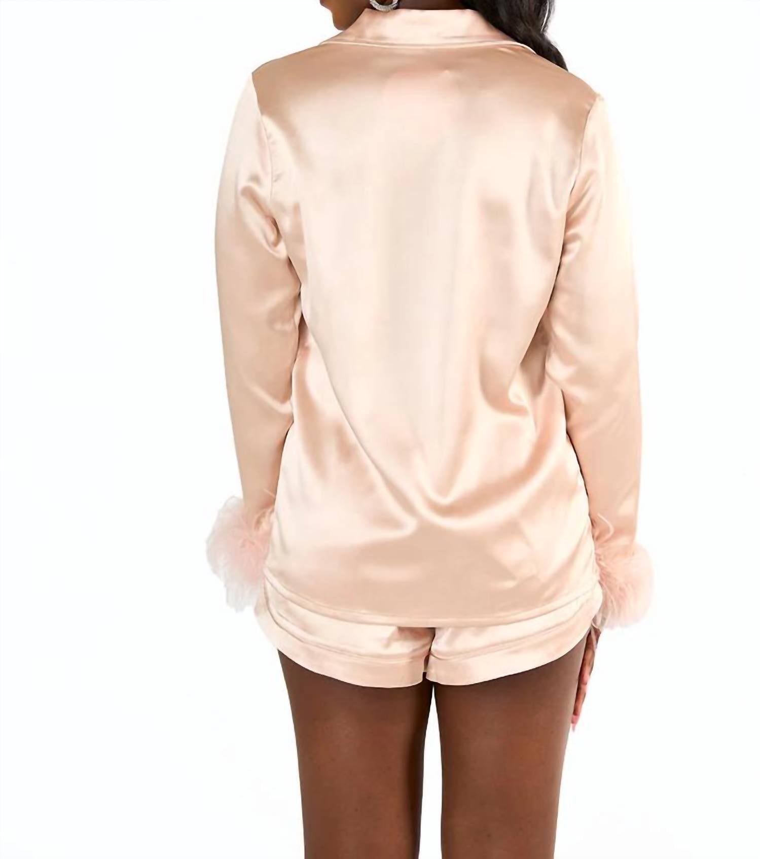 Luxurious escape. Adorned in an elegant champagne hue. Ultra-soft with a graceful button-down design. Featuring a chic collar and long sleeves. Culminate in dainty detachable feather cuffs. Paired with cozy tie-waist shorts. Elastic waistband. Meticulously crafted from 100% Polyester. Silky feel against the skin. True to size and relaxed fit.