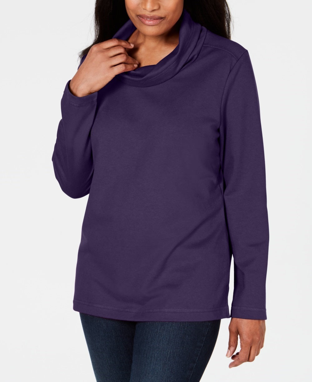 Hits at hip; approx. 27" long|Due to generous sizing, we suggest sizing down for the perfect fit|Cowl-neck|Cotton/polyester