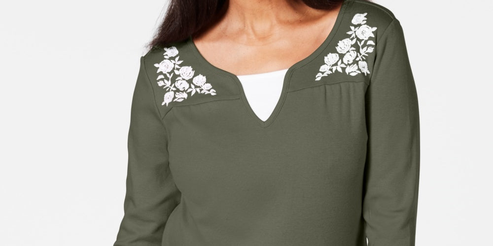 Relaxed fit; hits at hip; approx. 26 long|Due to generous sizing; we suggest sizing down for the perfect fit|Split scoop neckline with contrast inset|Floral embroidery at front yoke; rounded hemline|3/4-sleeves
