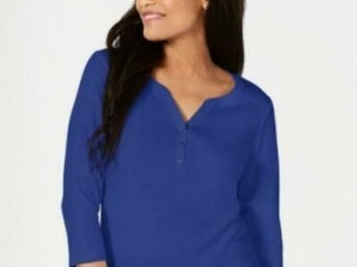 Hits at hip|Designed to fit and flatter 5'4" and under frame|Split neckline with three-button closure|Split neckline with three-button closure