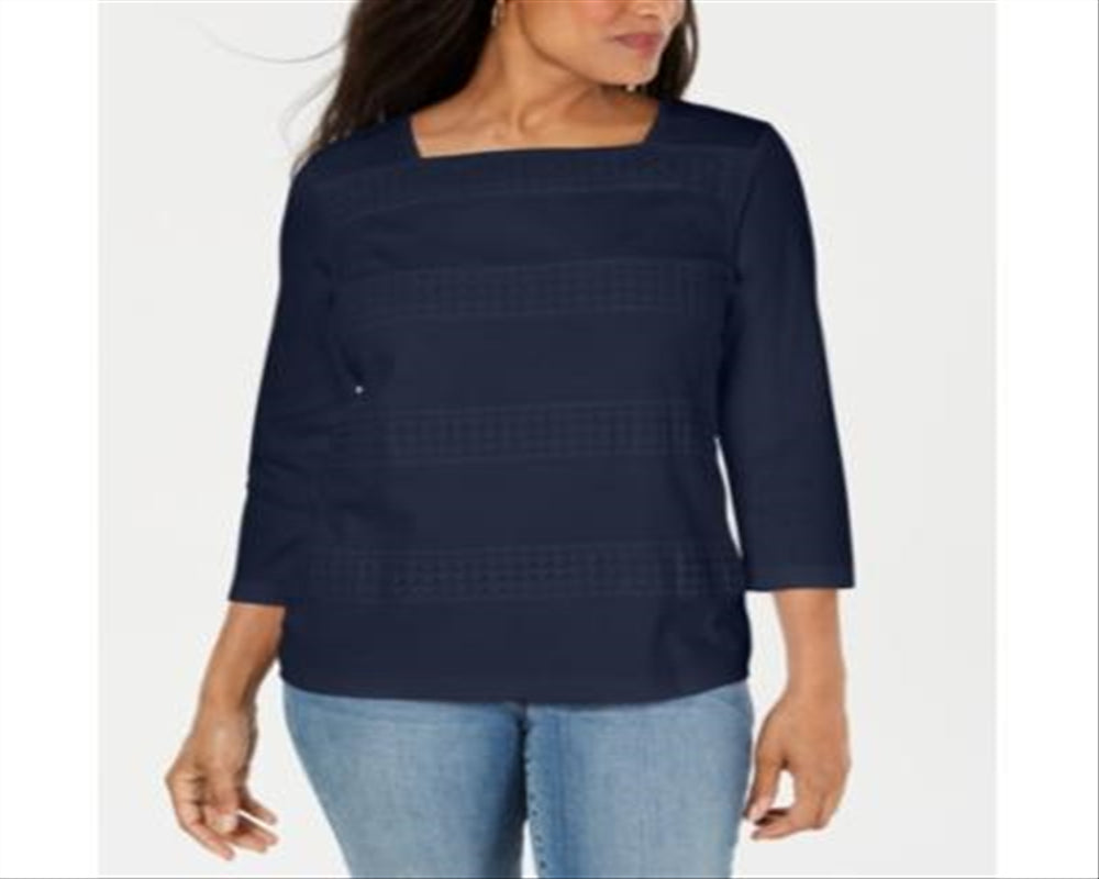 Karen Scott Women's Square Neck Lace Stripe Top Blue Size Medium