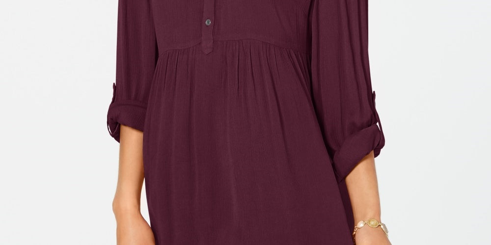 Relaxed fit; hits below hip; approx. 30 long|Designed to fit and flatter 5'4 and under frame|Point collar; front button closures|Babydoll seam styling|Roll-tab sleeves