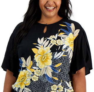 JM Collection Women's Keyhole Neck Floral Top Black Size 1X