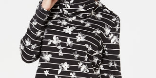Karen Scott Women's Floral Print Striped Funnel Neck Top Black Size PS