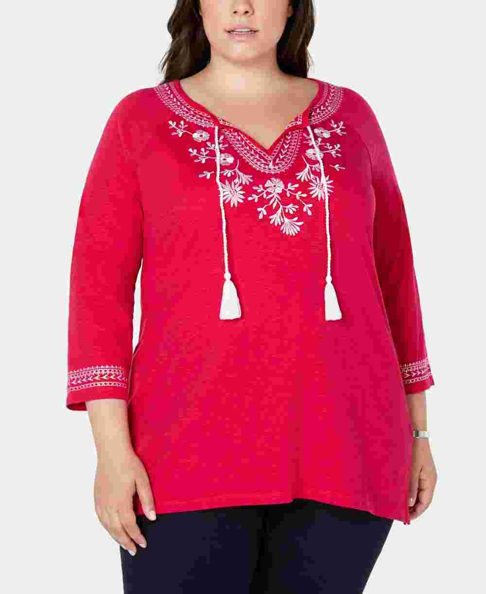 Charter Club Women's Plus Size Cotton Embroidered Peasant Top Pink Size 3X