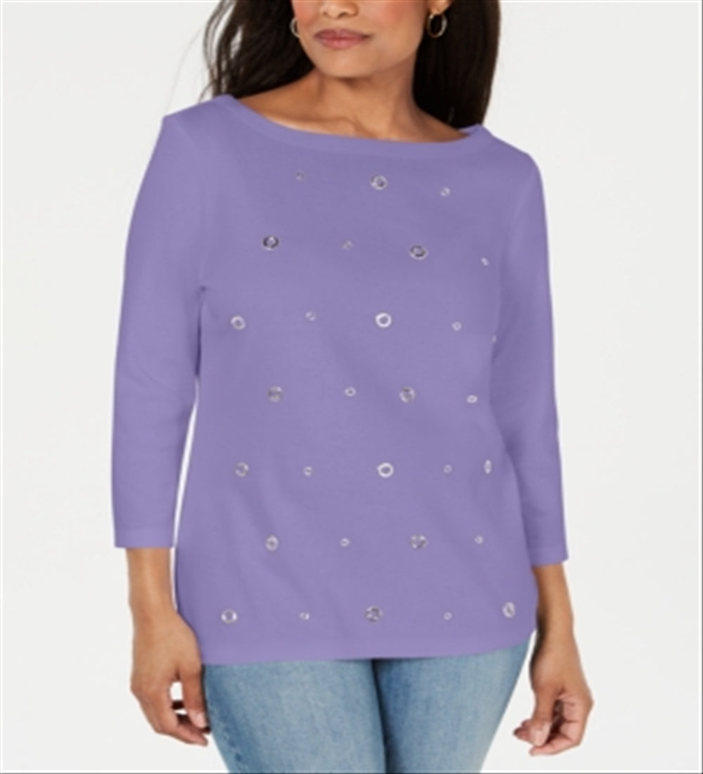 Shinny grommets adorn the front of this comfy cotton top from Karen Scott| styled with a flattering boat-neckline for an updated look|