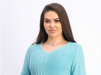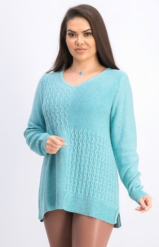 Relaxed fit; hits at hip; approx. 28-1/2" long|Due to generous sizing, we suggest sizing down for the perfect fit|V-neck|Blocks of mixed knit stitches at front; ribbed hemline band with side vents|Long sleeves with ribbed cuffs